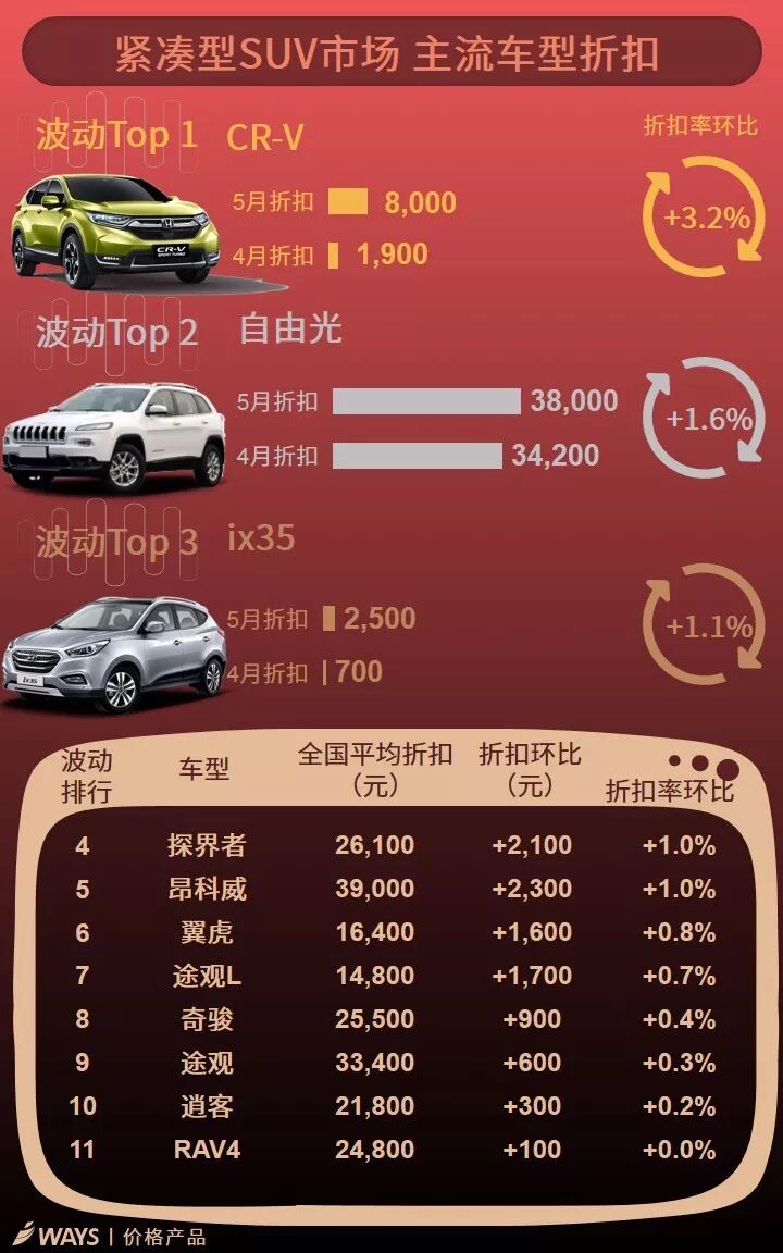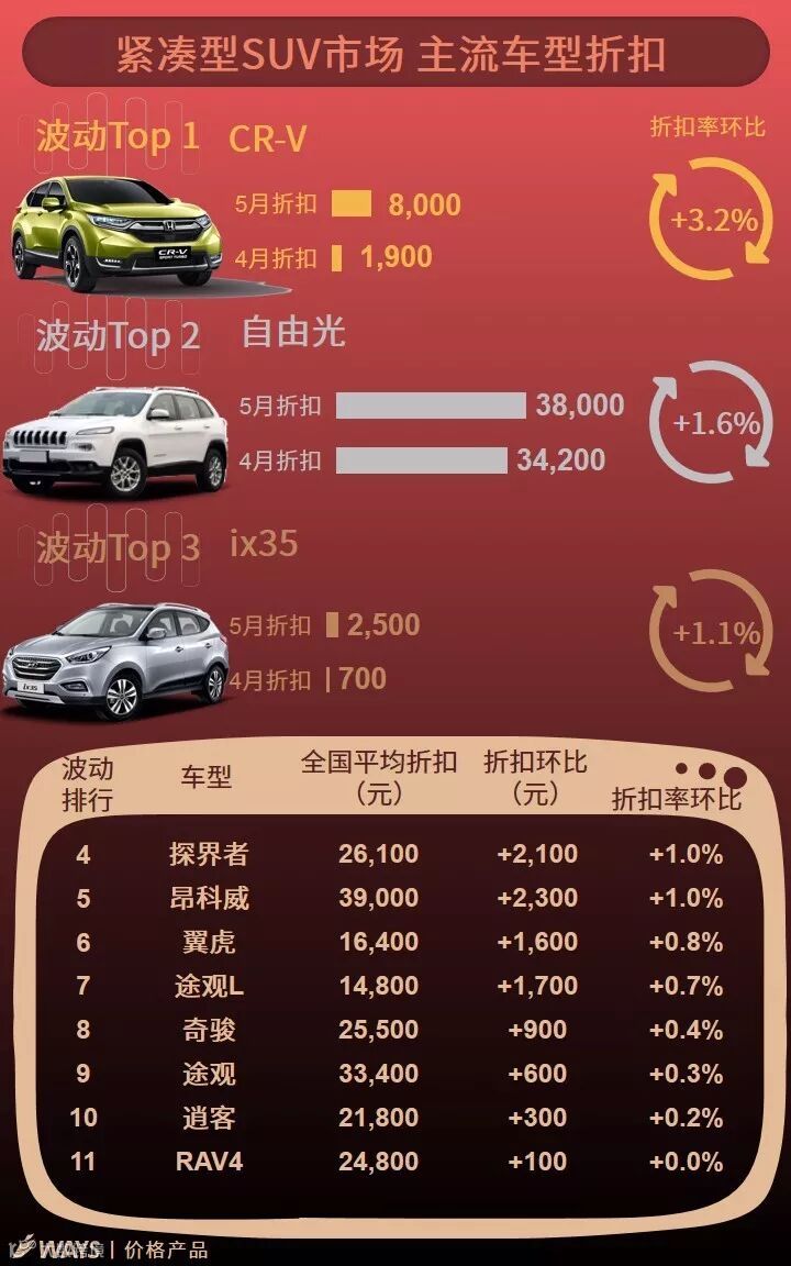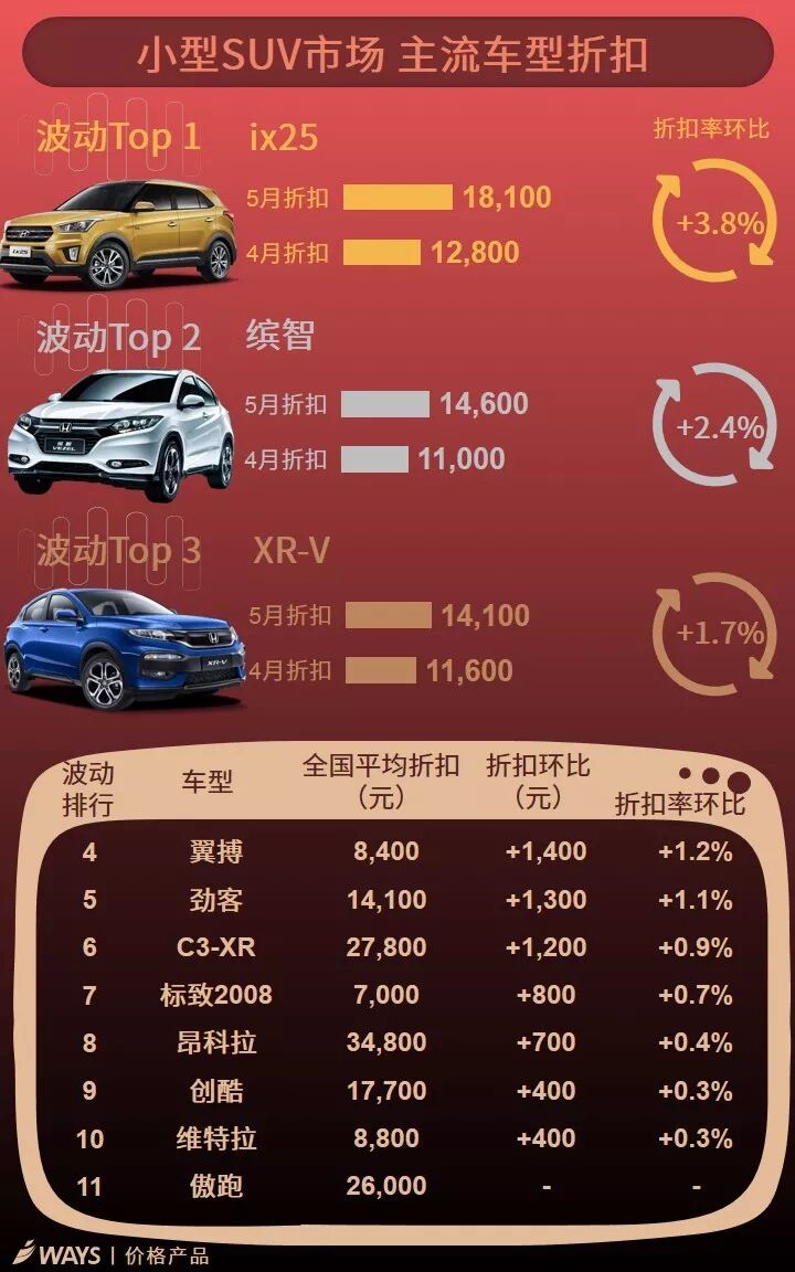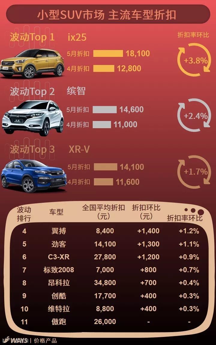 车型方面,受关税下调影响,雷克萨斯旗下车型官方指导价下调,折扣有所回收。本田、福特、大众等品牌月末冲量,旗下车型促销力度有所加大,其中,本田缤智和XR-V终端优惠增加明显,环比增加2500-3600元;福特福克斯和福睿斯折扣增加1700-1800元;大众速腾、高尔夫和明锐折扣亦增加1400-1800元。另外,北京现代ix25的折扣也有5300元的提升。