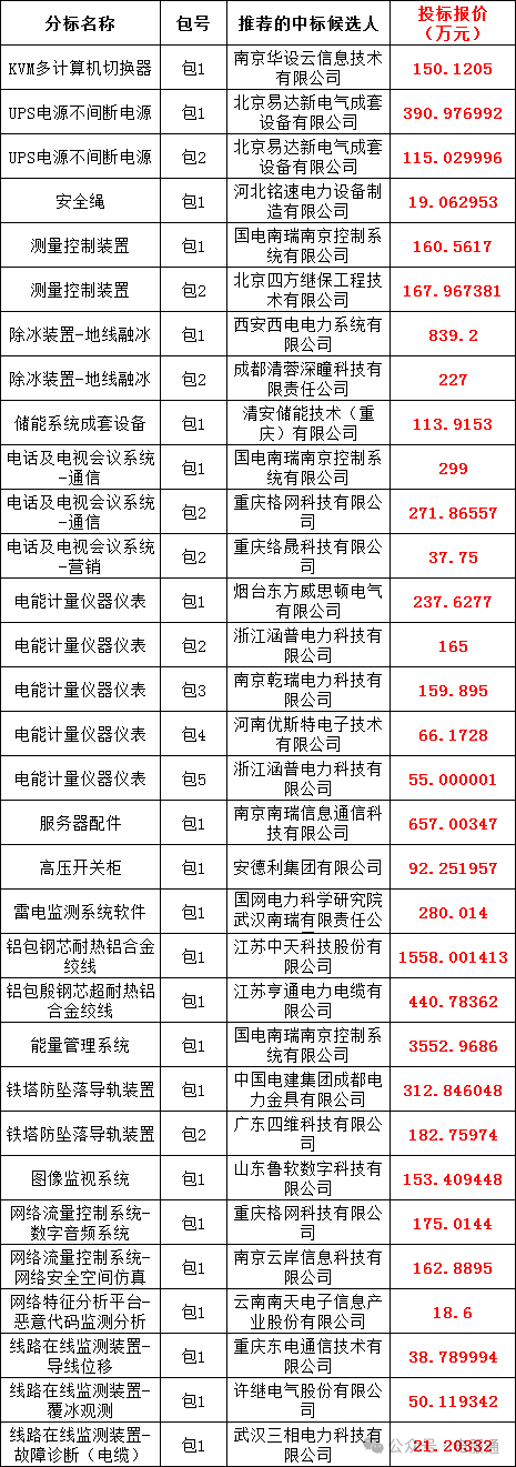 国网重庆市电力公司2024年第四次物资公开招标采购(招标编号:2024W4)评标工作已经结束。依据《中华人民共和国招标投标法实施条例》、《招标公告和公示信息发布管理办法》对中标候选人公示的规定,现将评标委员会推荐的中标候选人予以公示,公示期3日。投标人或者其他利害关系人若对评标结果有异议的,请在中标候选人公示期间以书面形式(邮件)提出。