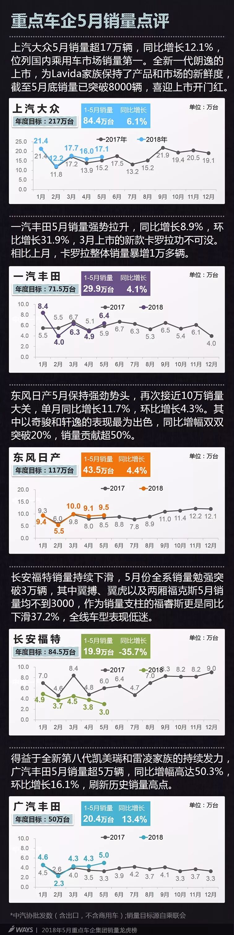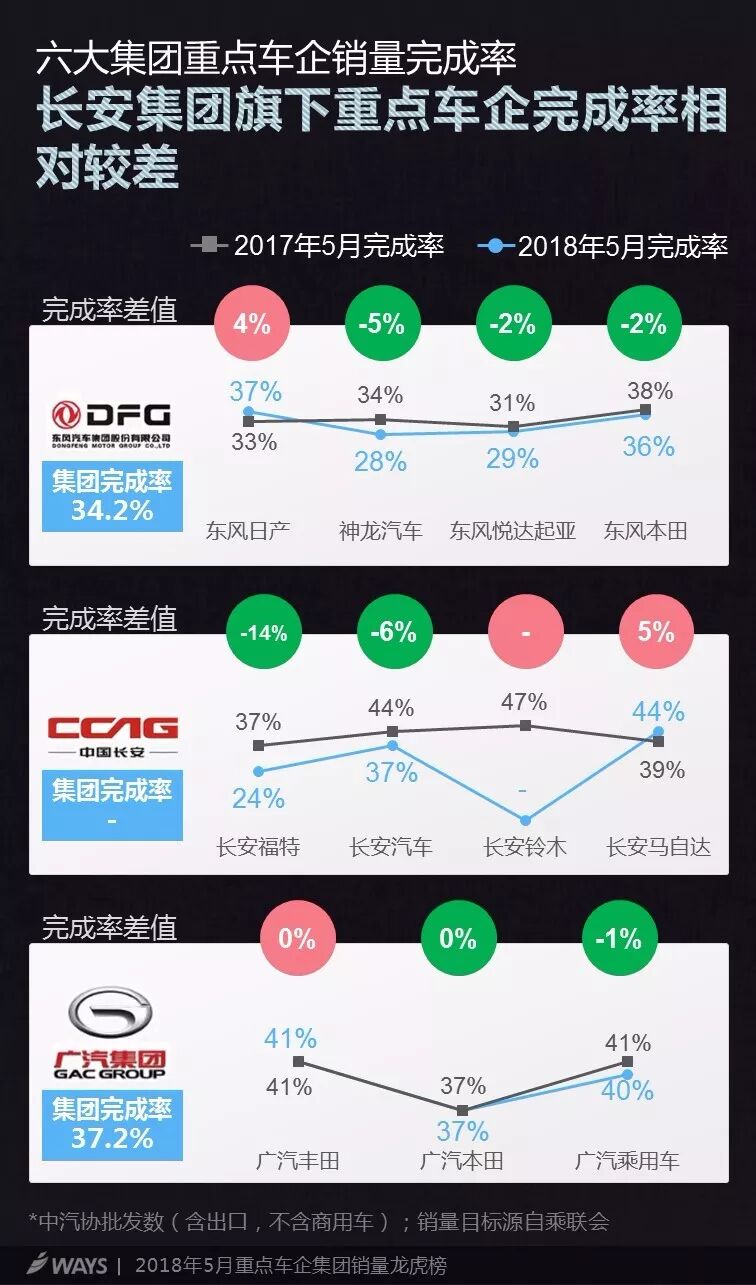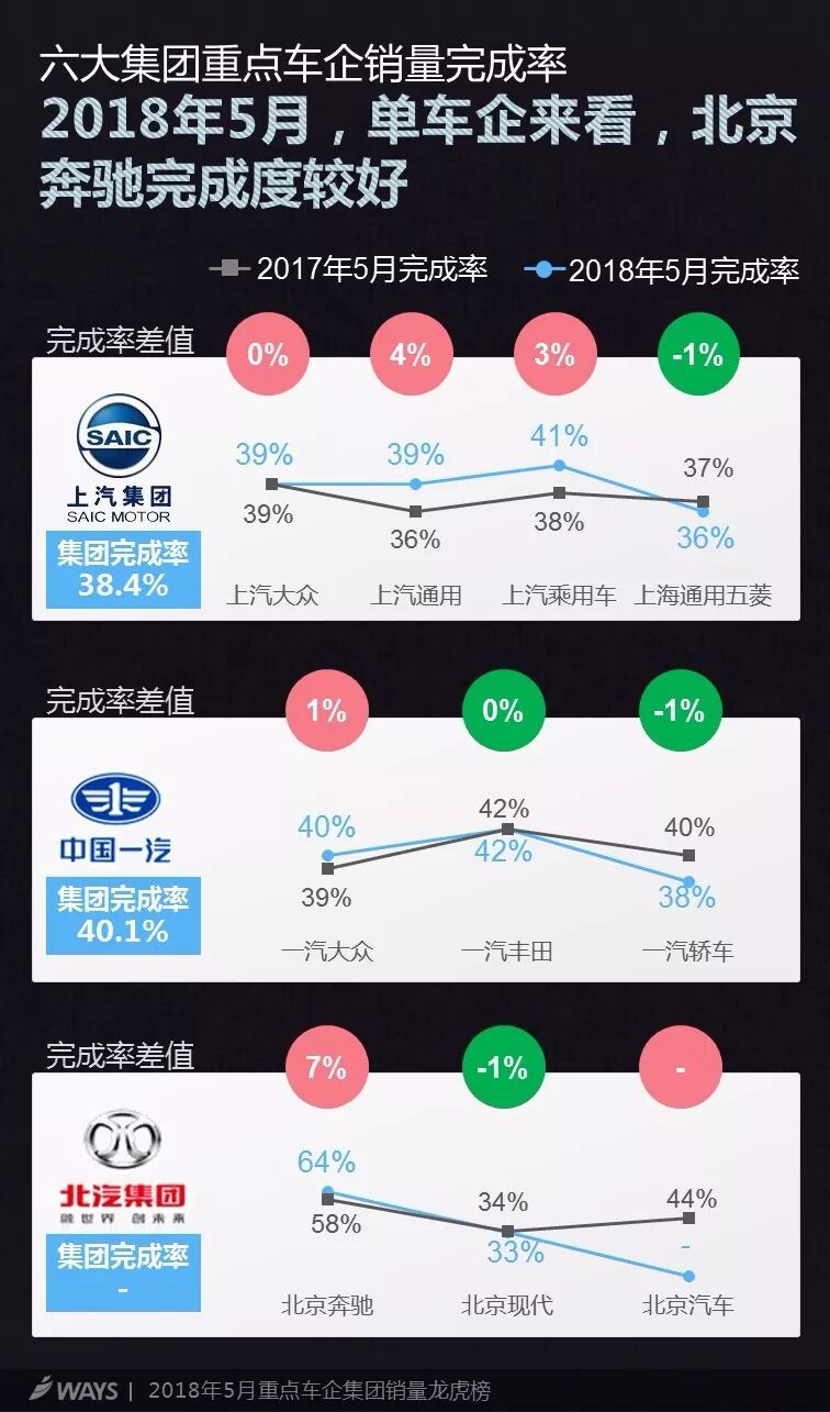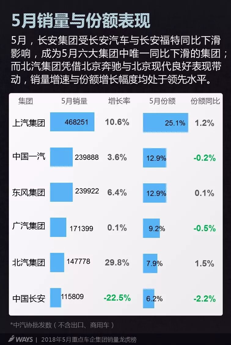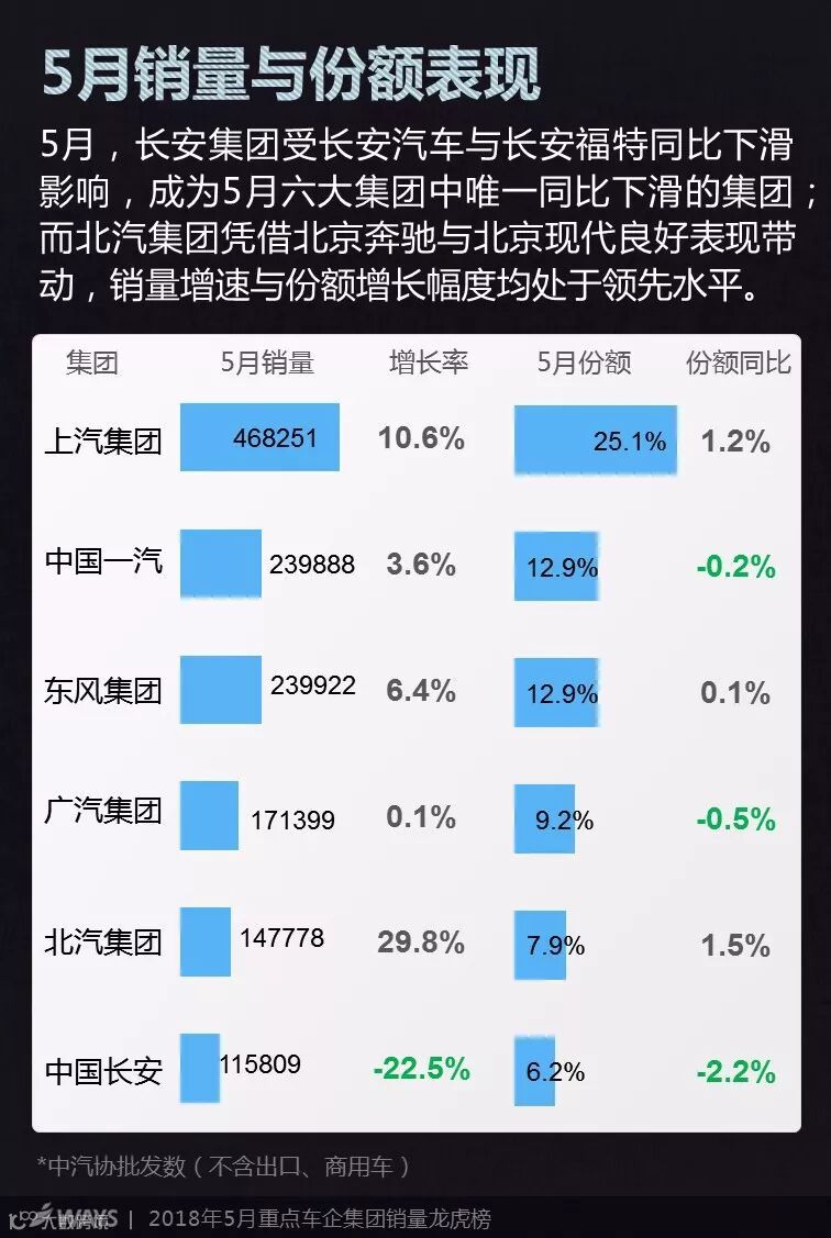 2018年5月,长安集团受长安汽车与长安福特同比下滑影响,成为5月六大集团中唯一同比下滑的集团;而北汽集团凭借北京奔驰与北京现代良好表现带动,销量增速与份额增长幅度均处于领先水平。