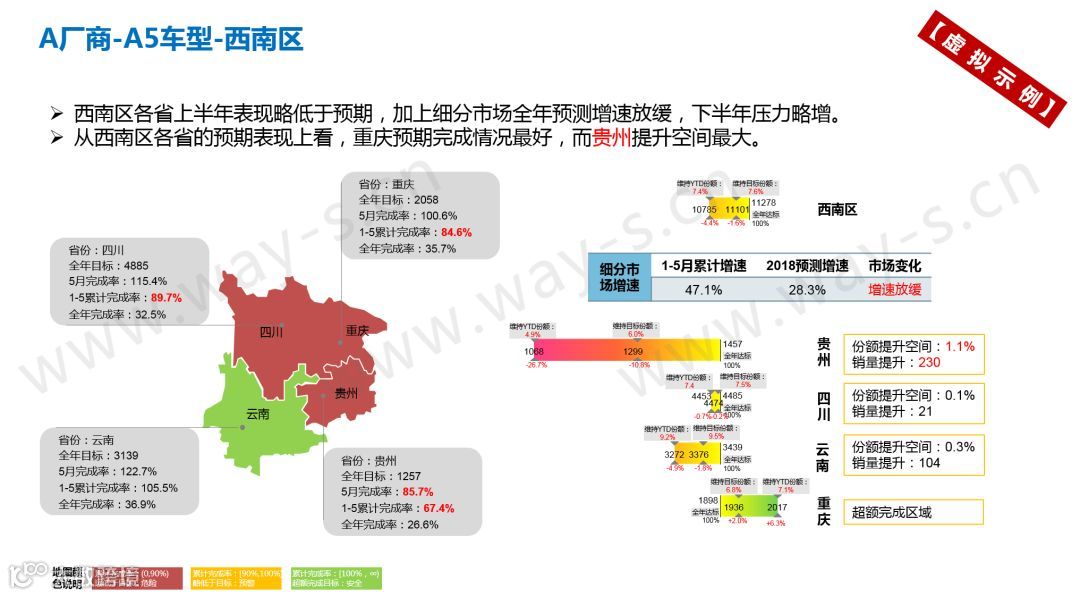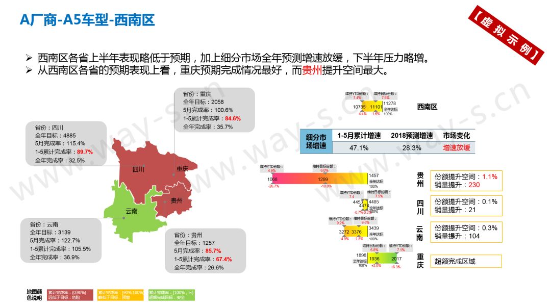 举个例子,当某A企业的A5车型出现了销量问题,系统在第一时间发出红灯预警,显示问题区域所在为西南、西北与华北区域。精准定位到西南区域,进一步细看省份销量情况可以发现,2018年1-5月,A5车型在贵州、重庆、四川的累计销量完成率均不足90%,显示红灯报警,又以贵州地区的销售压力尤为明显。在进行多车型多区域的销量目标管理时,这种由总到分的系统化平台能显著提升决策者的工作效率。