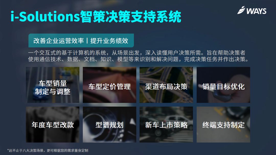 值此背景,威尔森“智策决策支持系统”应势而生,从厂商工作场景出发,构建了车型销量制定与调整、年度车型改款、车型定价管理等系列决策场景,助力厂商迅速识别市场机会与问题,作出基于事实的最优决策方案。