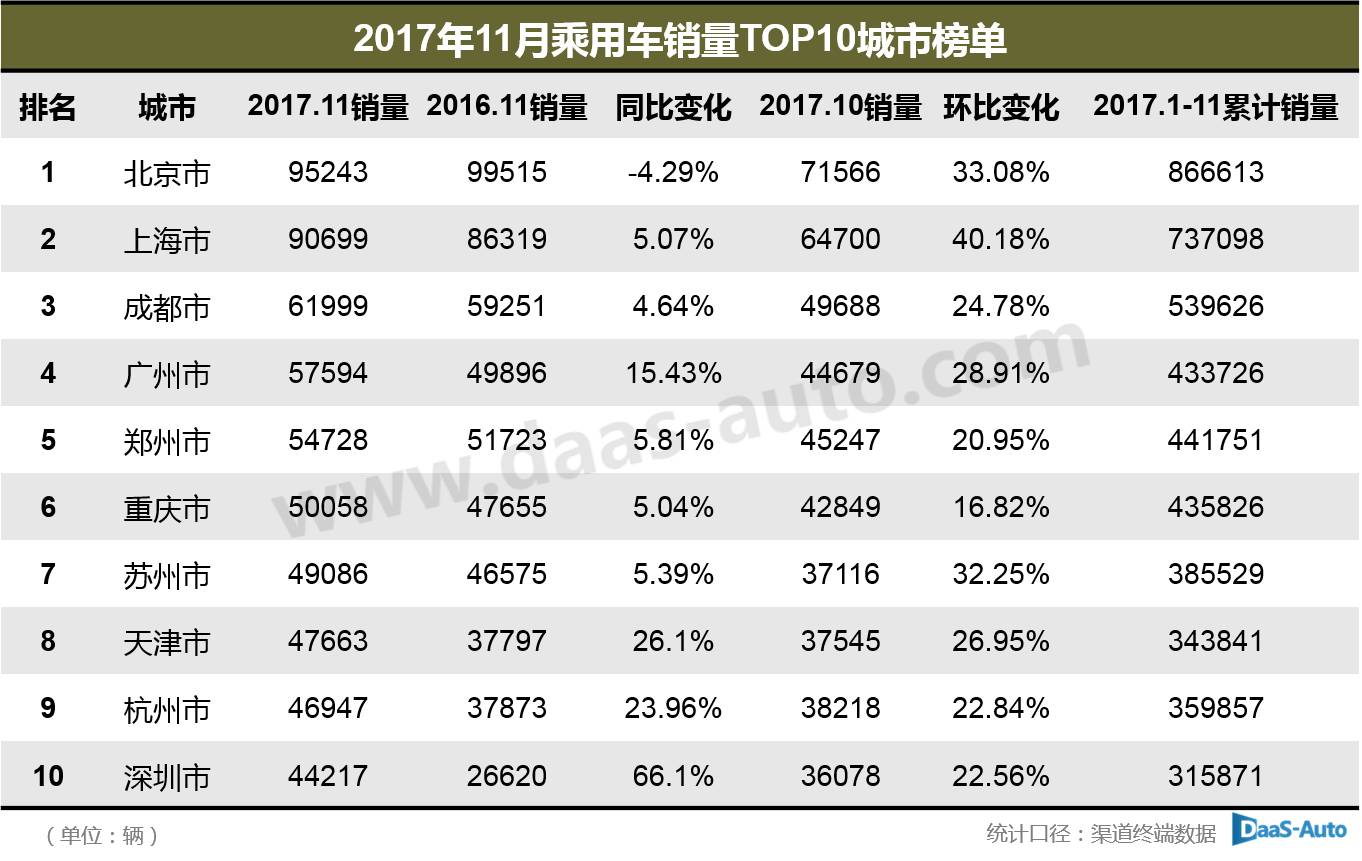 据达示数据显示,乘用车销量仍高度集中在北上广等一线城市。11月份,前十大城市乘用车销量较10月均有显著的提升,其中,北京、上海乘用车成交量均超9万辆,北京市以95243辆的销量成绩位居榜首。