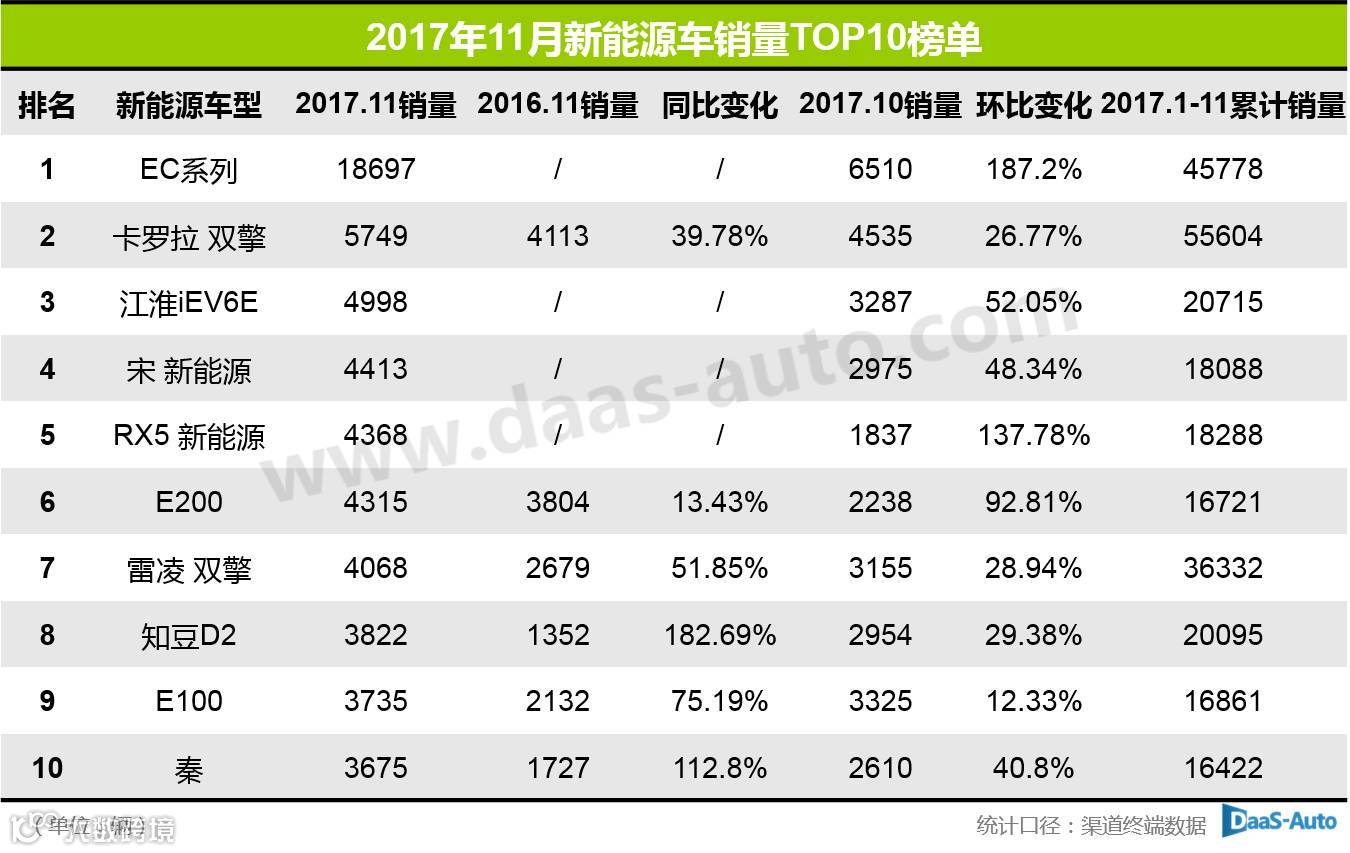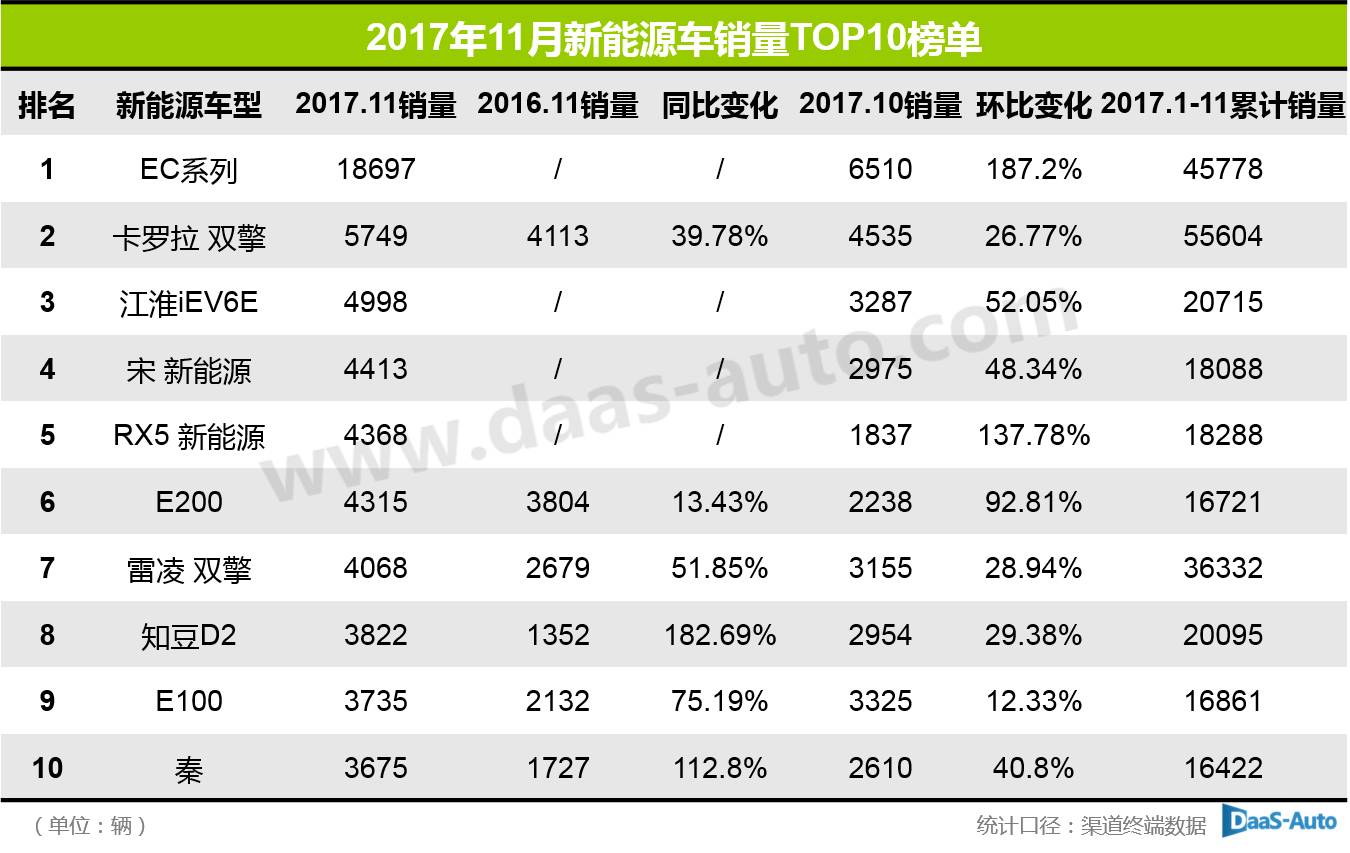 11月新能源乘用车销量维持普涨态势,其中,EC系列环比增长187.2%,以18697辆的成绩位居第一名,是唯一一款销量过万辆的新能源汽车。