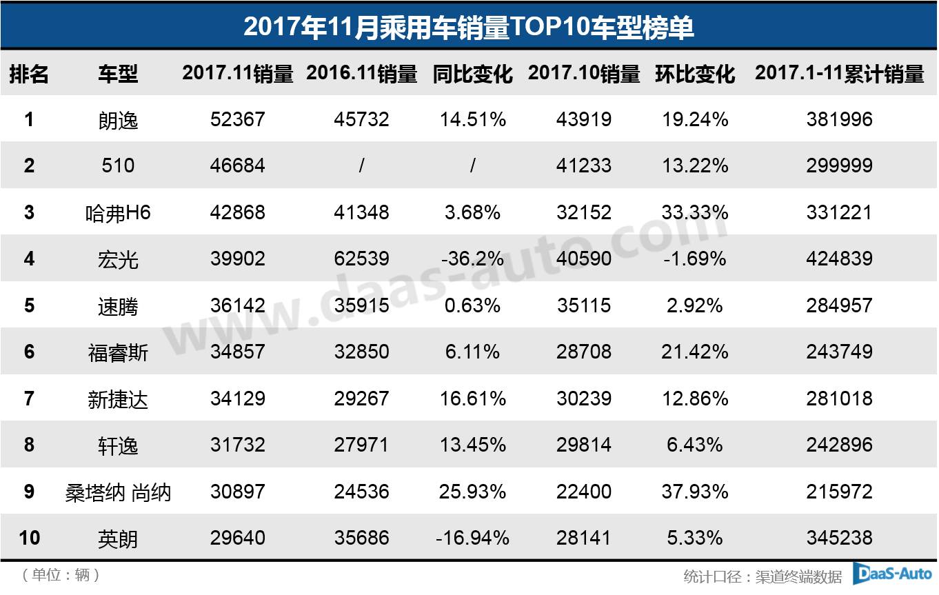 年末冲刺,热销车型再创新绩。11月份,朗逸销量冲破5万辆,同比实现14.51%的增长,荣登车型销量榜首。宝骏510紧随其后,以46684辆的成绩领跑哈弗H6。排名第三的哈弗H6销量环比增幅高达33.33%,销量重回4万辆阵营。