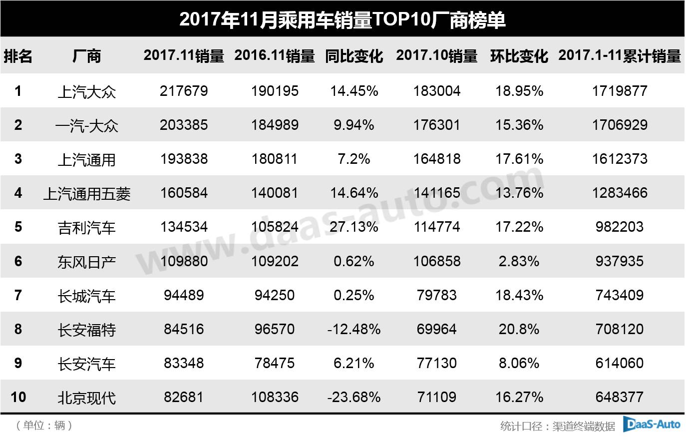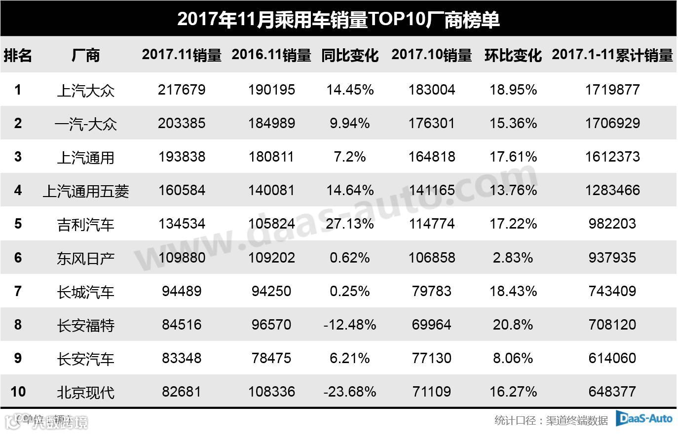 基于11月终端销售数据统计,达示数据汇总了乘用车厂商、车型、城市和新能源车四个维度的销量排行榜。2017年临近年末,一起来看下各大车型的销量表现吧~