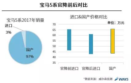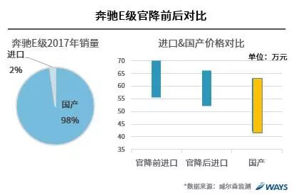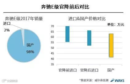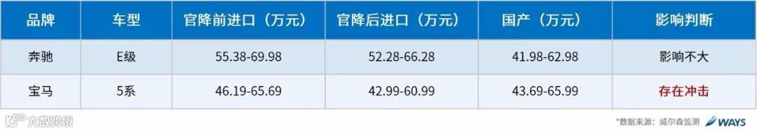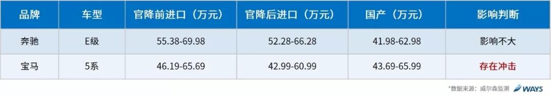 进口奔驰E级官降后对其国产车型影响不大;进口宝马5系官降后与国产车型价格重叠度高,存在较大冲击风险。