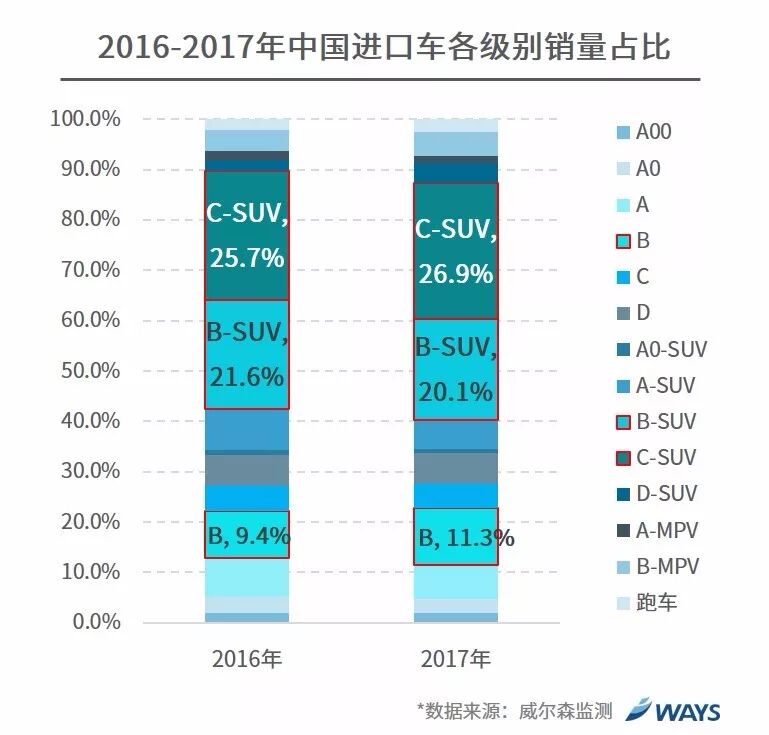 近两年,进口车在中国销量稳中有升,并主要集中在B级、B-SUV及C-SUV等细分市场,三者销量贡献超50%以上,关税下调带来的一系列价格调整,预计将对进口车整体市场以及重点细分市场销量增长带来积极影响。