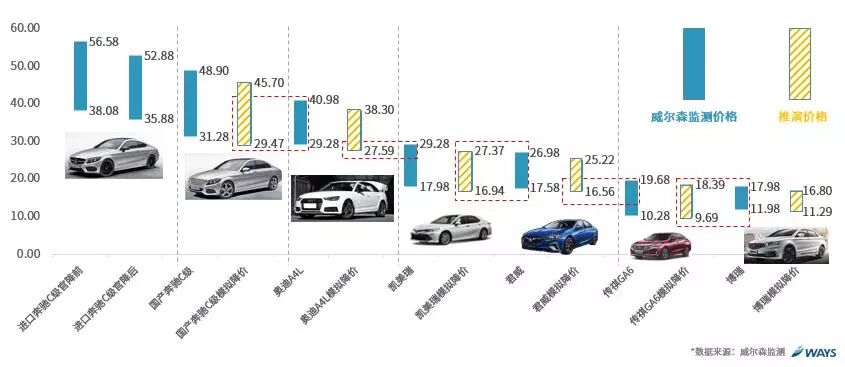 以奔驰C级为例,进口奔驰C级官降后,价格区间接近国产奔驰C级,进而将影响国产奔驰C级销量;国产奔驰C级若需要稳定销量,将对当前售价进行调整(或增加同等比例的促销优惠),威尔森通过测算发现,国产奔驰C级的售价区间应调整为29.47-45.70万元。