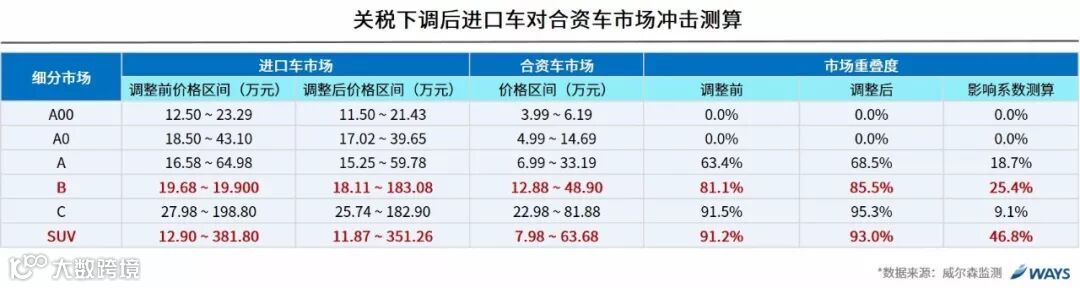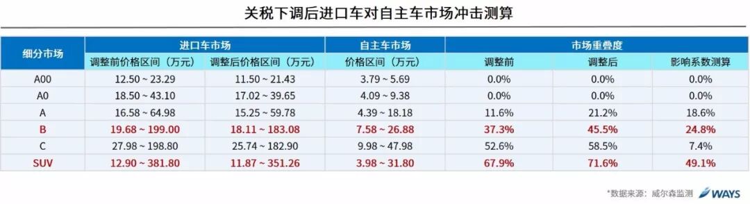 威尔森围绕关税下调进口车对合资、自主品牌下各细分市场的冲击进行了测算,以理想状态的8%售价折扣计算,我们发现无论是合资还是自主品牌,其中国内B级、SUV级市场受到的冲击均较大。