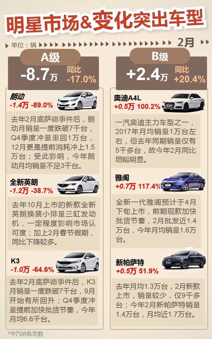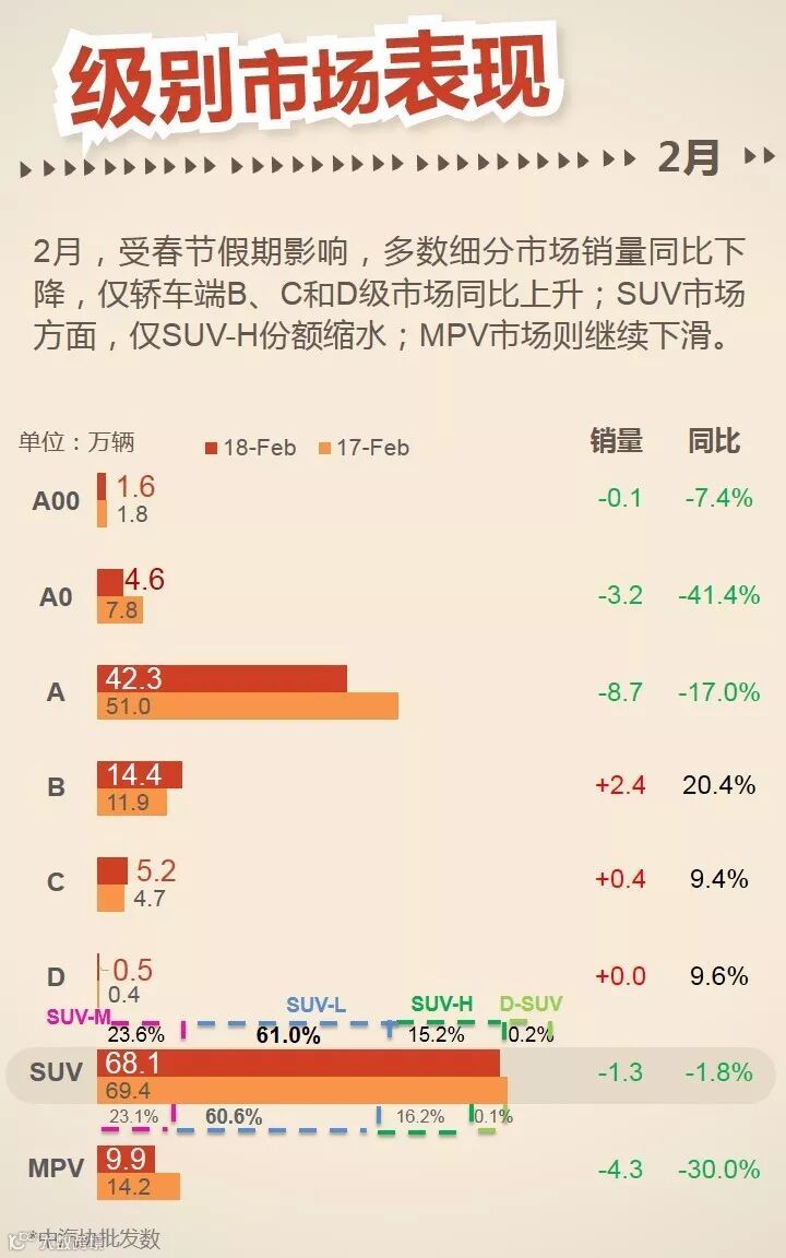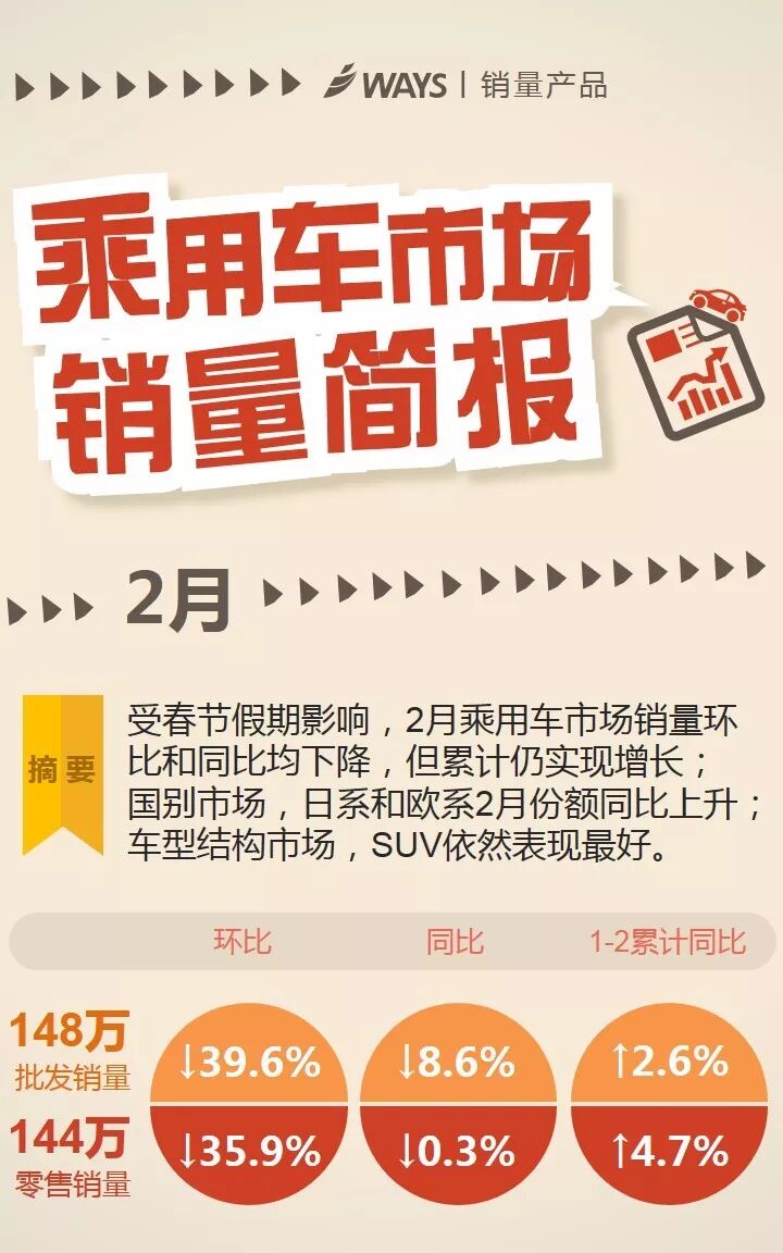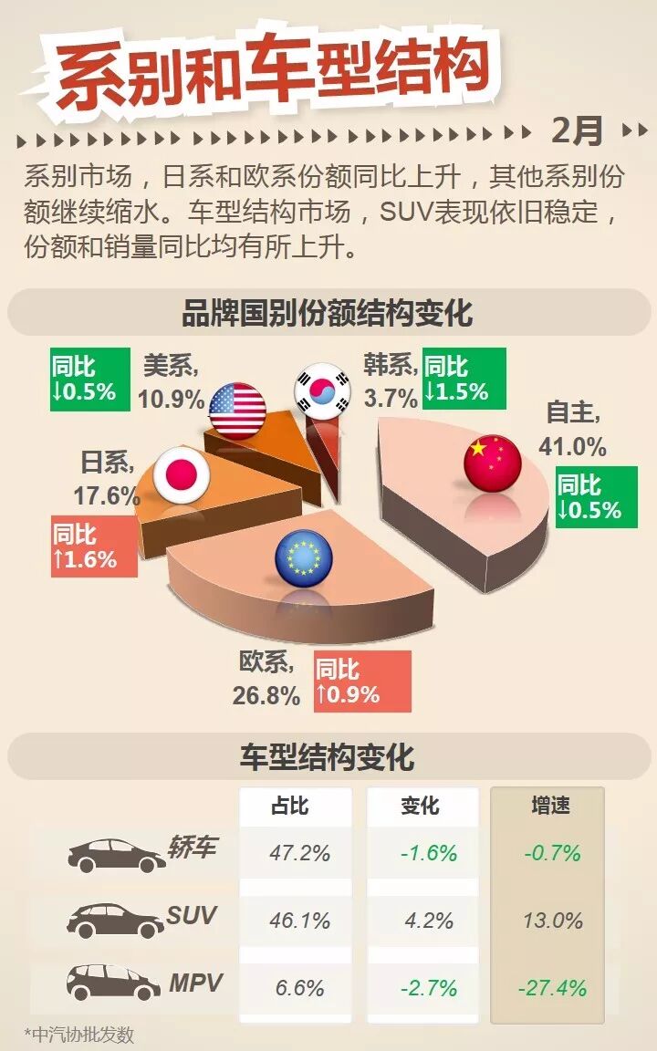 受春节假期影响,2月乘用车市场销量环比和同比均下降,但累计仍实现增长;国别市场,日系和欧系2月份额同比上升;车型结构市场,SUV依然表现最好。