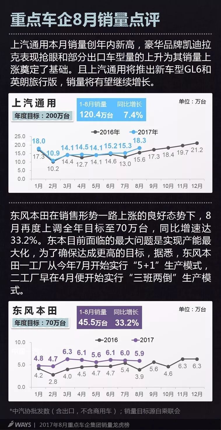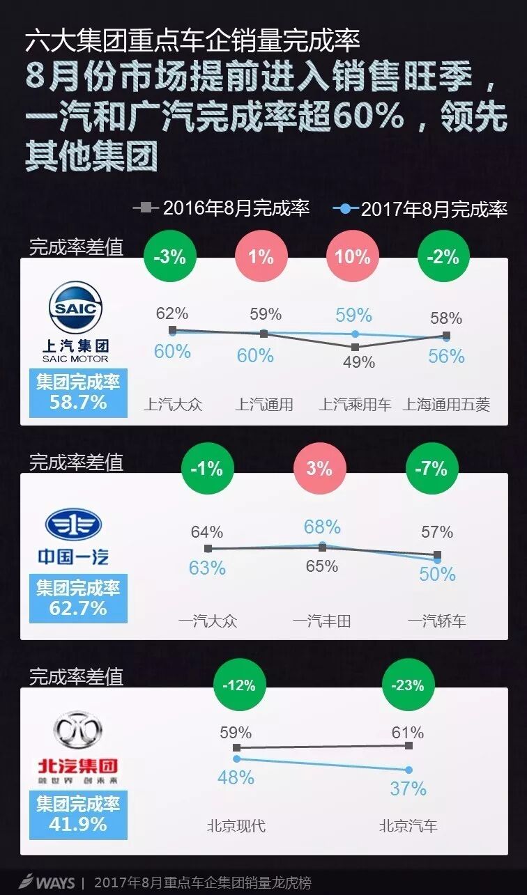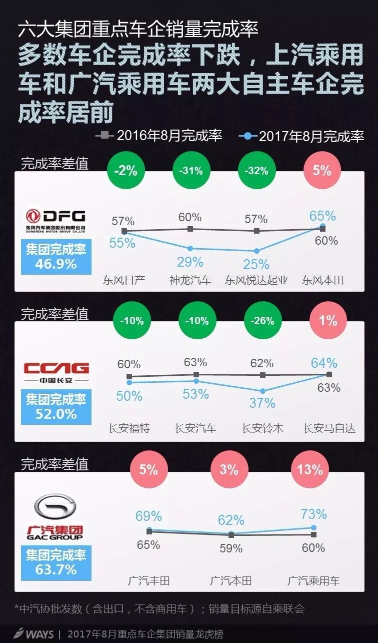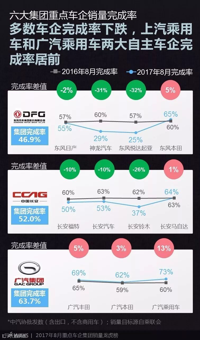 截至8月,多数车企完成率不及去年同期;东风本田却连续调涨销量目标,8月调至70万台,完成率仍高于去年同期;上汽乘用车和广汽乘用车两大自主车企完成率居前。