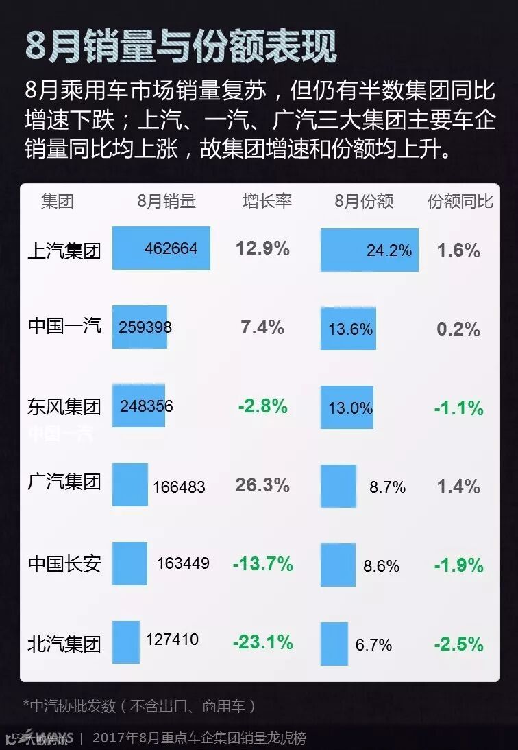 8月乘用车市场销量复苏,但仍有半数集团同比增速下跌;上汽、一汽、广汽三大集团主要车企销量同比均上涨,故集团增速和份额均上升。