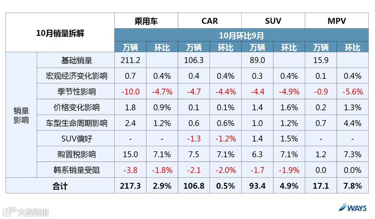 10月因国庆、中秋双节休假,工作日减少一周,季节性下降较大,继“金九”出现小幅增长后,“银十”扭头下转。综合所有影响因素来看,环比9月,10月乘用车市场在基础销量上有2.9%的增量。主要是购置税优惠2.5%及政策即将退出引发的提前购车共带来7.1%的增量。