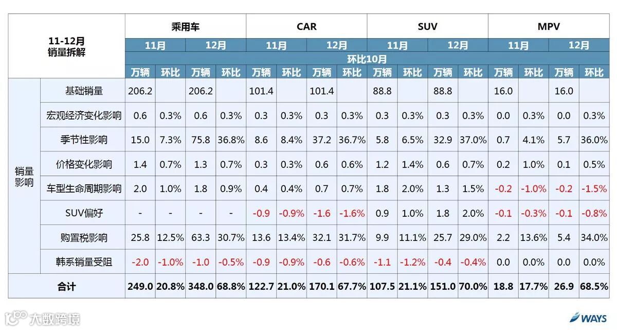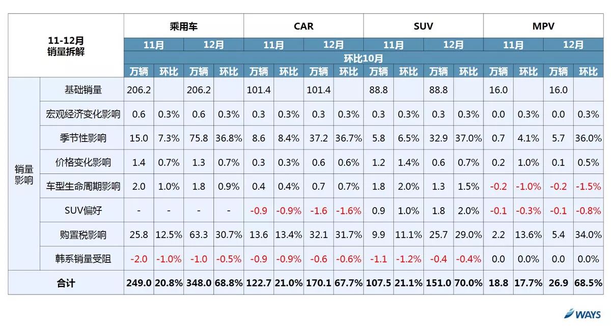 环比10月,三大细分12月在基础销量上均有超过65%的大幅增长,促动最大的同样是季节性上升及购置税优惠政策的利好影响,分别为Car带来36.7%、31.7%的增量,为SUV带来37.0%、29.0%的增量,为MPV带来36.0%、34.0%的增量。