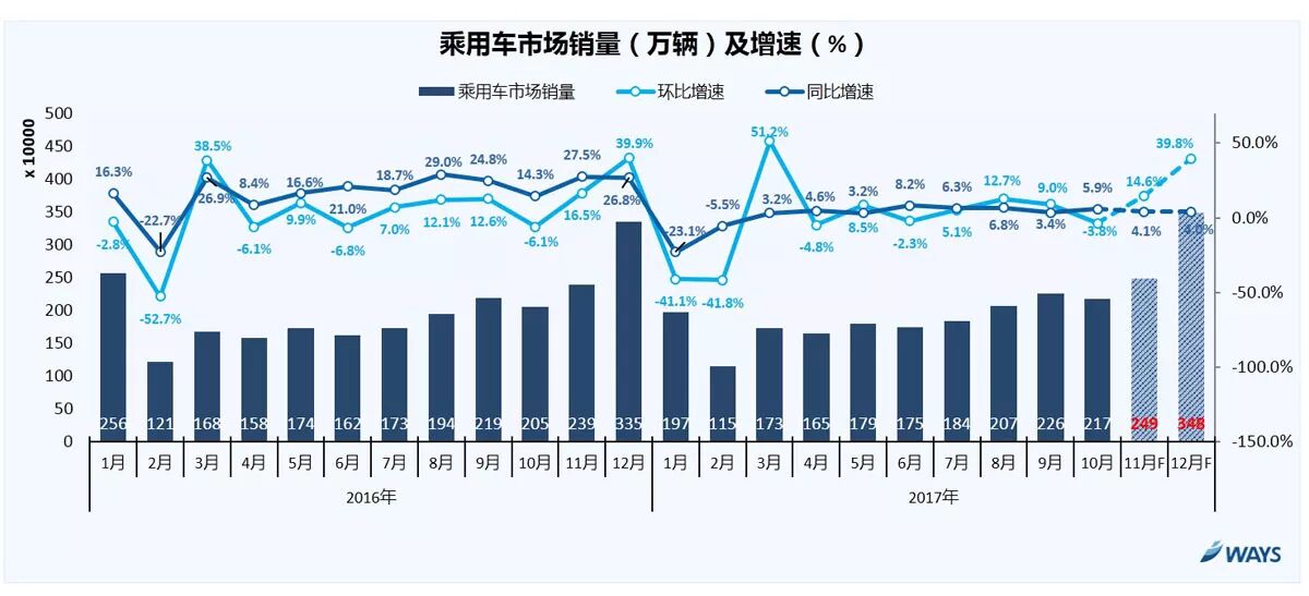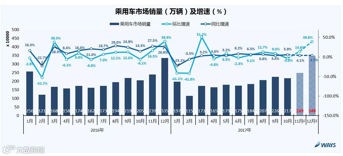 在各销量影响因素的综合作用下,11月乘用车市场环比10月,在基础销量上增加20.8%,促进增长的主要因素包括:购置税优惠2.5%持续带来利好影响及优惠政策即将退出导致的市场需求提前,共带来12.5%的增量,季节性回升,贡献7.3%的增量。
