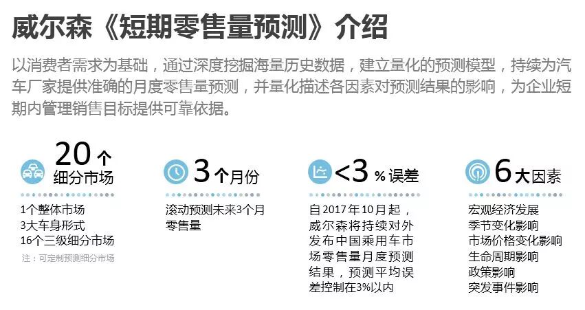 威尔森《短期零售量预测》,基于威尔森长期洞察,结合模型预测技术,以消费者需求为基础,通过深度挖掘海量历史数据,建立量化的预测模型,持续为汽车厂家提供准确的月度零售量预测,并量化描述各因素对预测结果的影响,为企业短期内管理销售目标提供可靠依据。