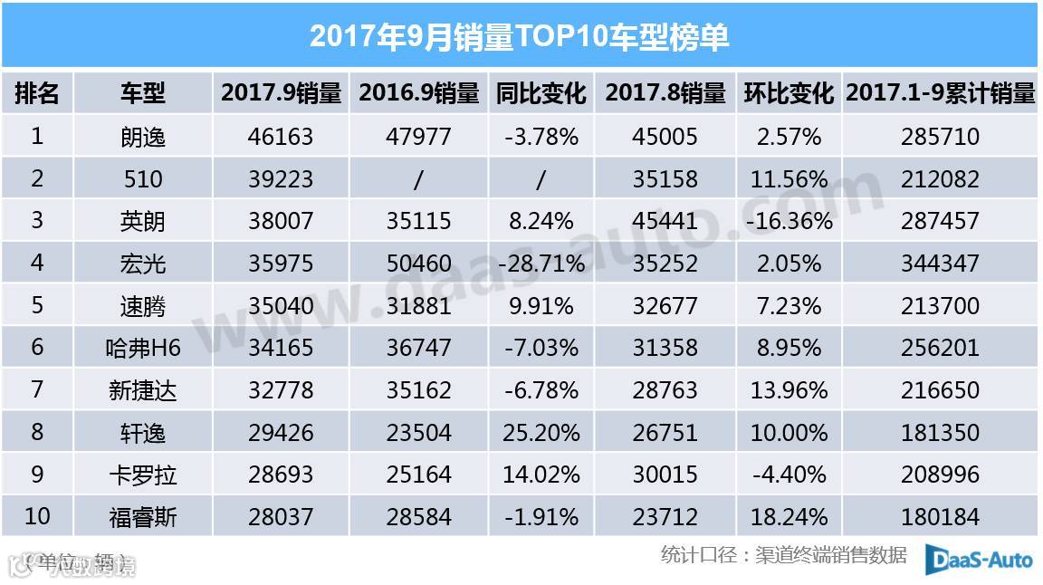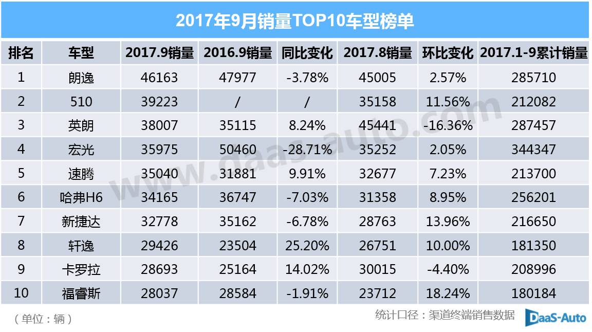 在车型销量前十榜单中,9月的排名有较大的变动。其中,朗逸一鼓作气摘得冠军宝座,9月销量为46163辆;新晋黑马宝骏510的名次也较8月提升了两名,最终以39223辆的成绩排名第二位;而8月高居榜首的英朗则退居第三位,9月销量为38007辆,环比下滑了16.36%。
