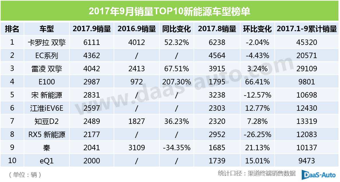 卡罗拉双擎仍是9月新能源车的销量冠军,销量为6111辆。紧随其后的是EC系列和雷凌双擎,9月销量均超过4千辆。值得一提的是,宝骏E100表现甚佳,销量达到2987辆,环比增长66.41%,名次由8月的第九上升至第四位。