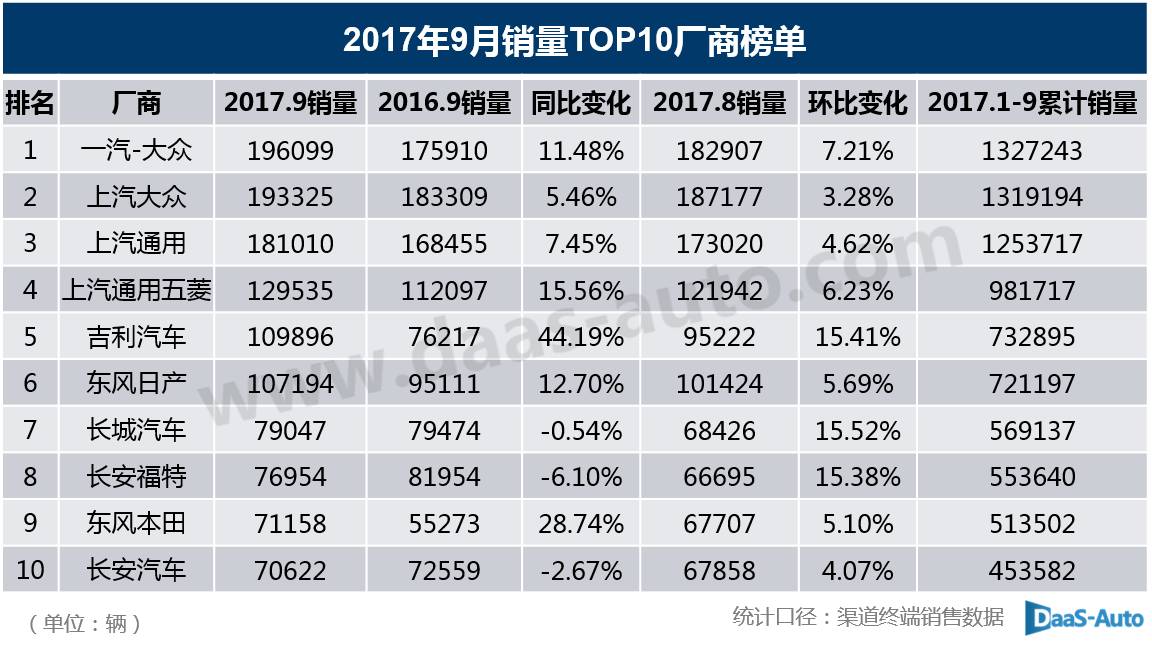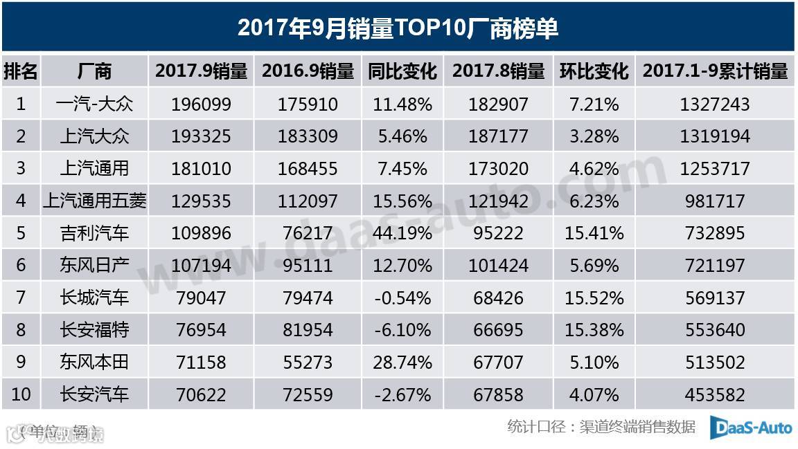 2017年9月我国乘用车的销量成绩单出来了。基于达示数据的渠道终端销售数据实时监测,现统计了乘用车厂商、车型、城市和新能源车四个维度的销量排行榜。