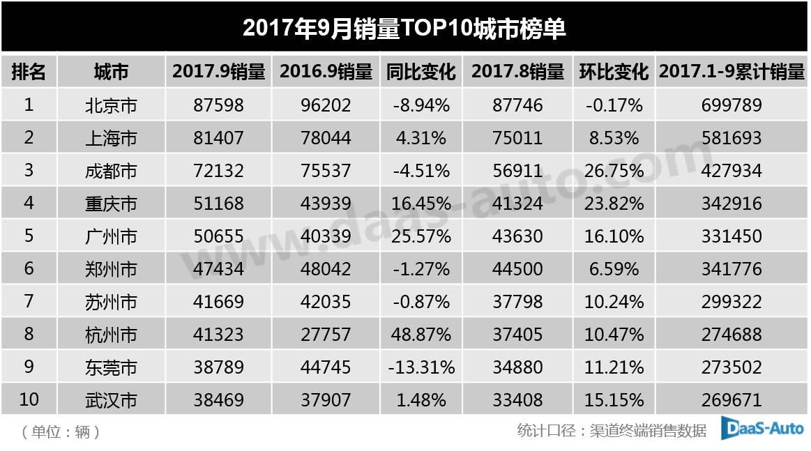 9月销量最大的三大城市仍是北京、上海和成都,其中北京为首,9月销量为87598辆;其次是上海,9月销量也超过8万辆,同比增幅为4.31%;成都位居第三,9月销量高达72132辆,环比增长26.75%。