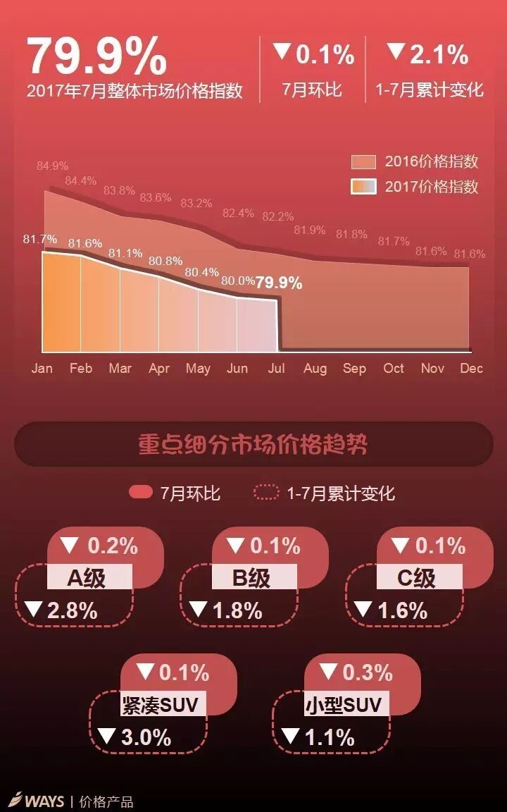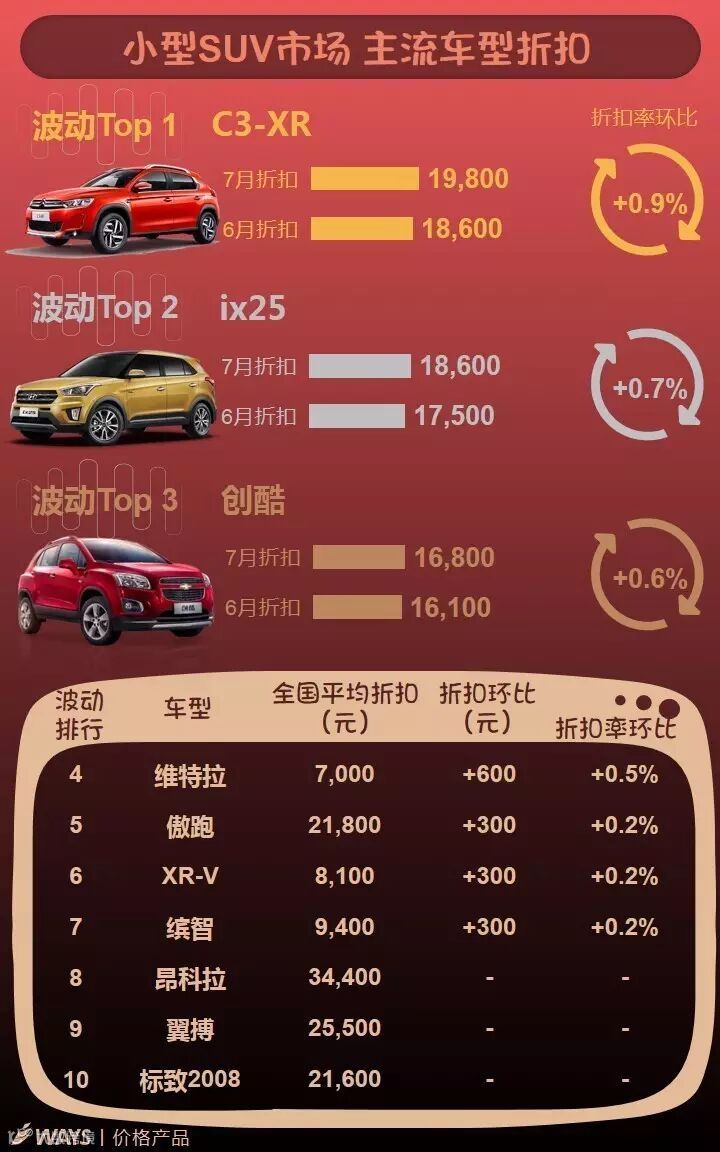 细分市场方面,受C3-XR、ix25和创酷价格下降带动,小型SUV市场价格下降0.3%;其次,A级轿车细分市场亦有小幅下降;其余细分市场变化不大。