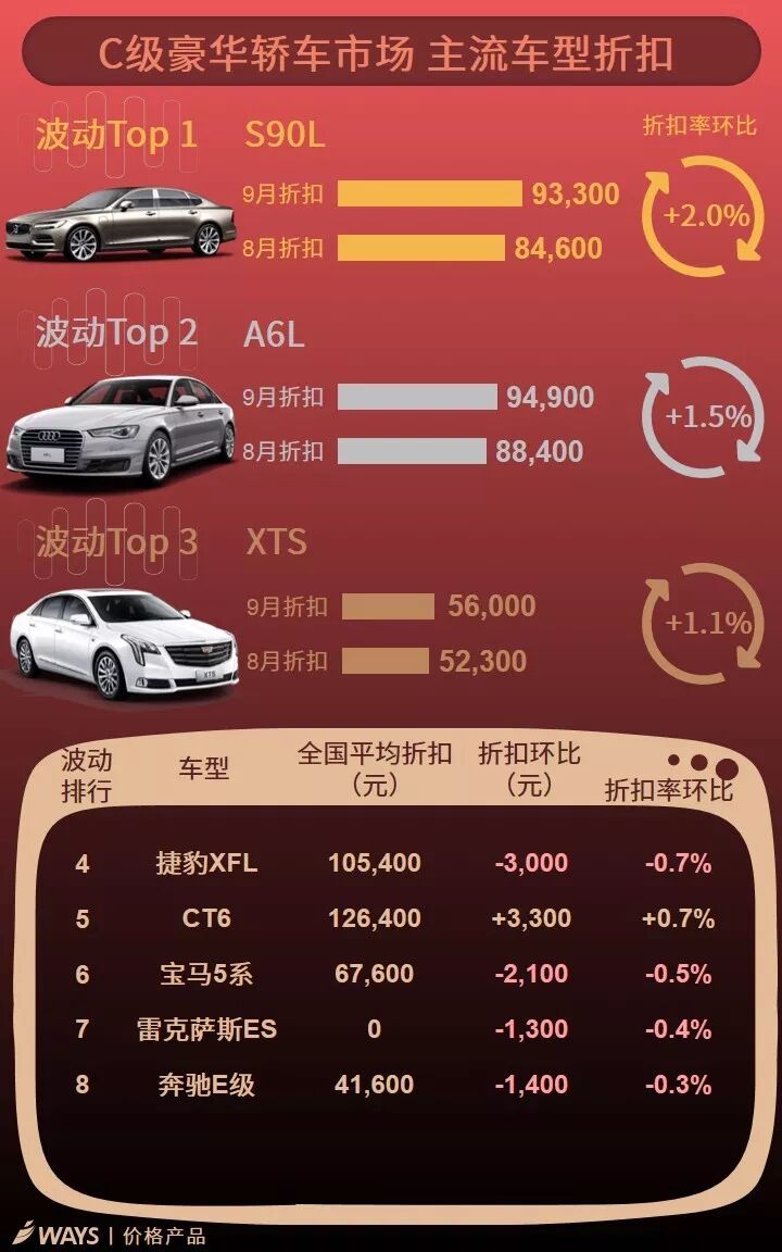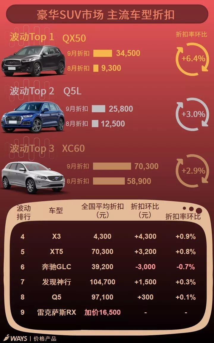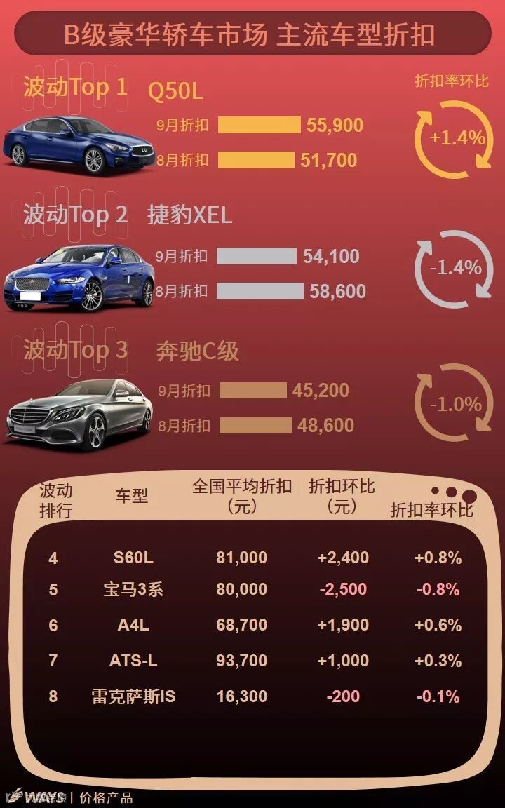 捷豹旗下XEL和XFL车型继8月大幅降价后,因资源减少9月优惠回收超3,000元。此外,英菲尼迪换代QX50 9月大幅降价,降幅达到6.4%,目前终端折扣为34,500元。