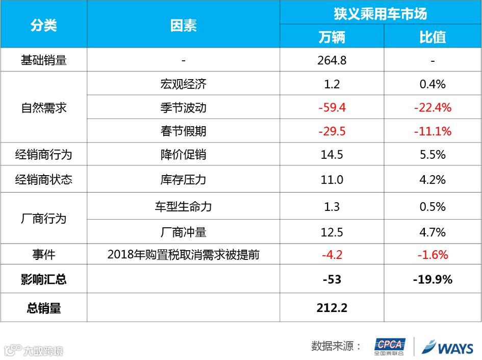 其次,相比2018年1月,MPV市场3月在基础销量上减量13.7%,季节性下降和春节假期分别造成13.0%和7.0%的减量,购置税优惠政策取消引发的需求提前,透支了2018年初的销量,对3月仍造成2.5%的减量;此外,降价促销带来4.3%的增量,库存压力减少带来3.5%增量。