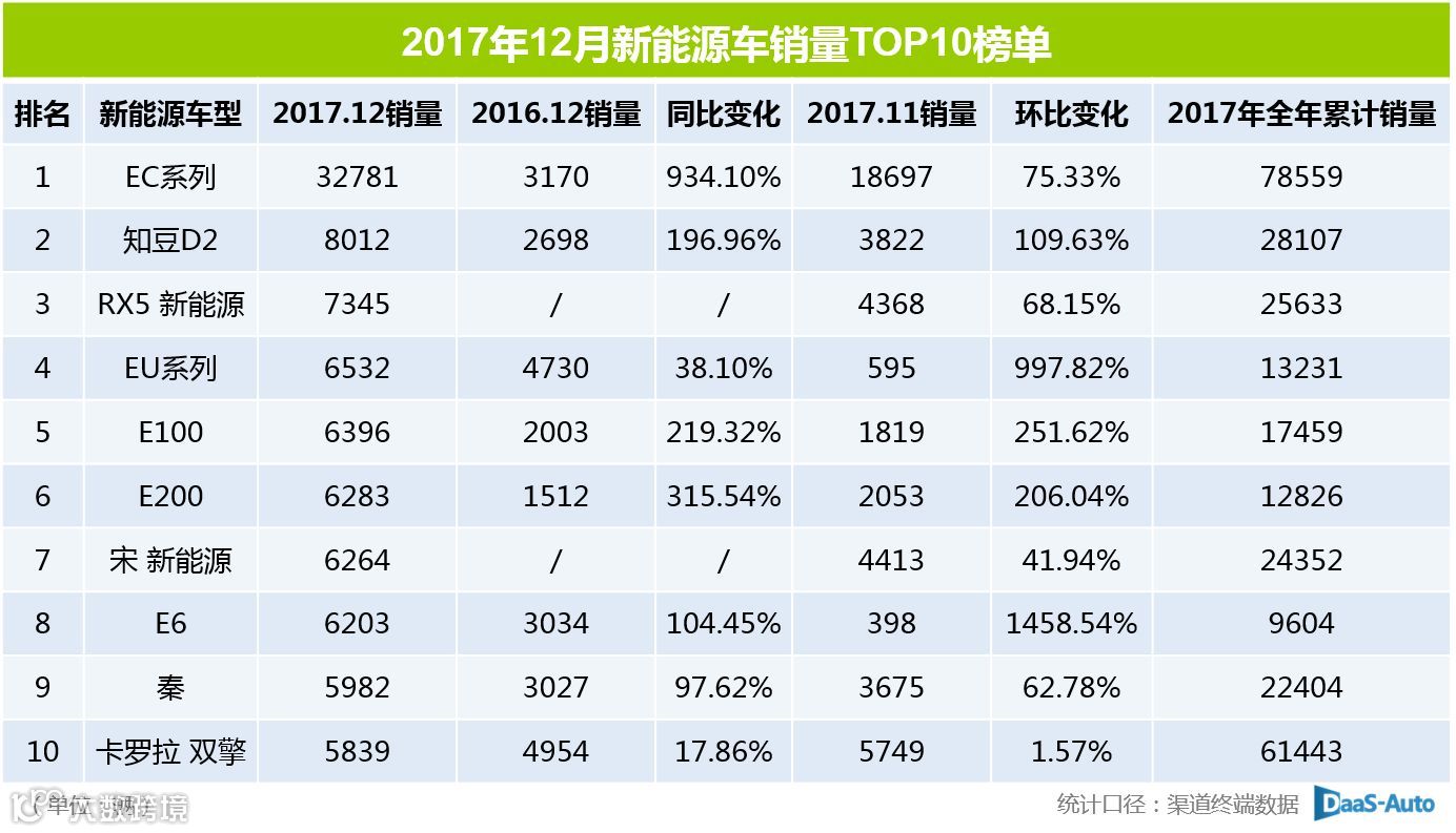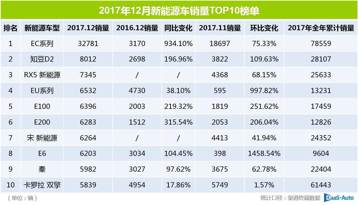 2017年,可以说是新能源汽车市场飞速发展的一年,12月单月全国新能源车销量突破10万辆,全年累计销量超过70万辆。其中,EC系列车型全年贡献了78559辆的销量,12月单月销量同比激增934.1%至32781辆,成为最畅销的新能源车。
