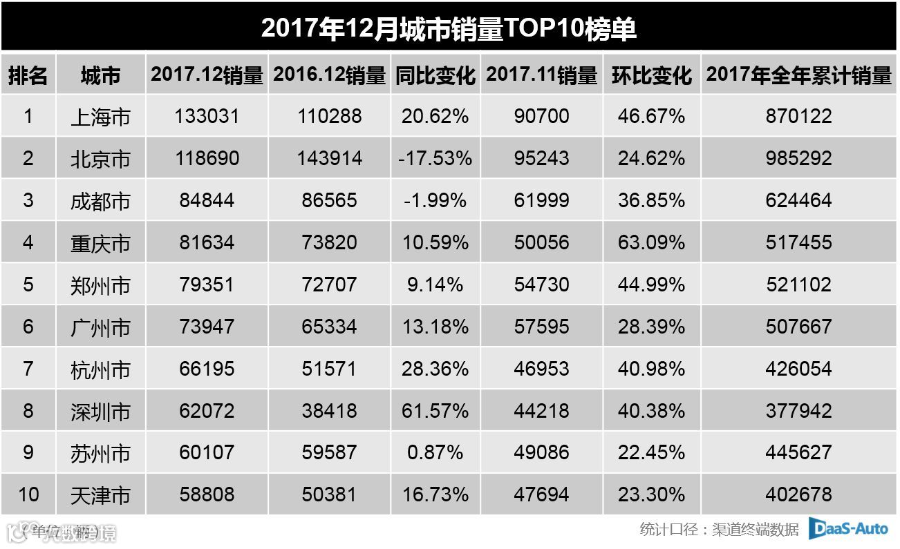 城市方面,长期以来上海市、北京市和成都市销量均名列前茅。12月上海汽车市场销量表现领跑北京市和成都市,交付了133031辆新车,全年累计交付了870122辆。而北京市全年累计交付了985292辆新车,成为2017年全国乘用车销量最高的城市。