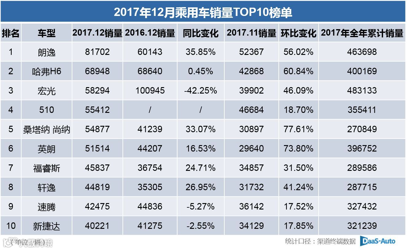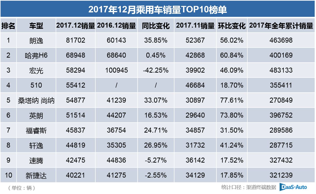 2017年12月乘用车销量TOP10排行榜