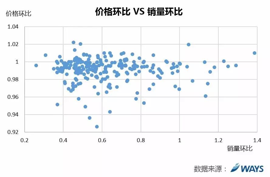 从上图可以看出,价格的下降与销量的变化并无显著的规律。