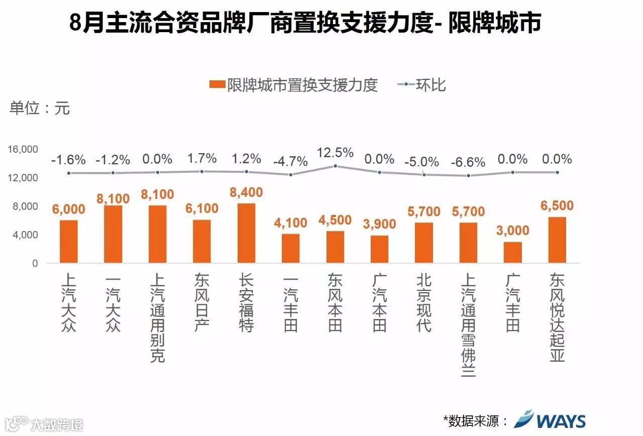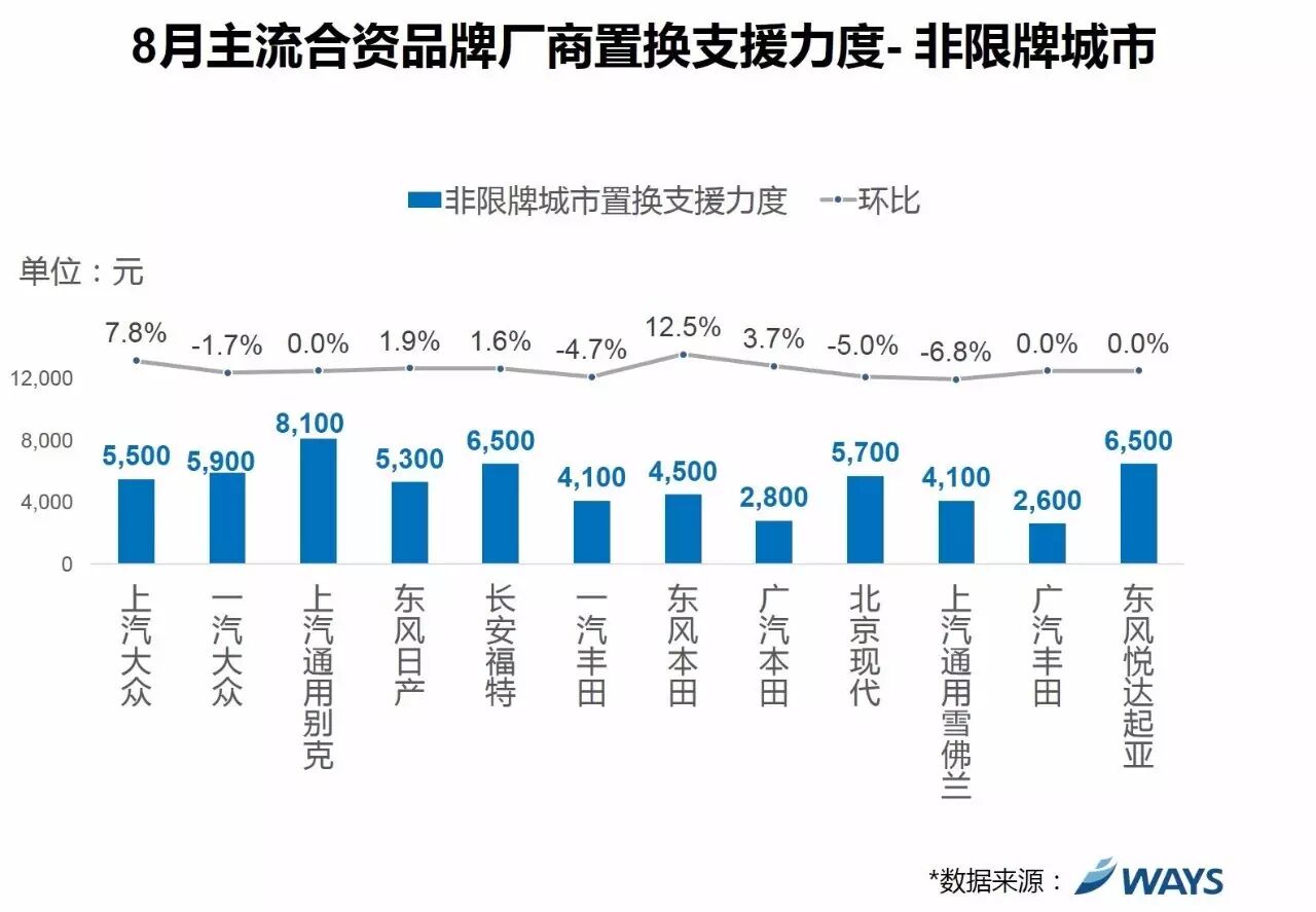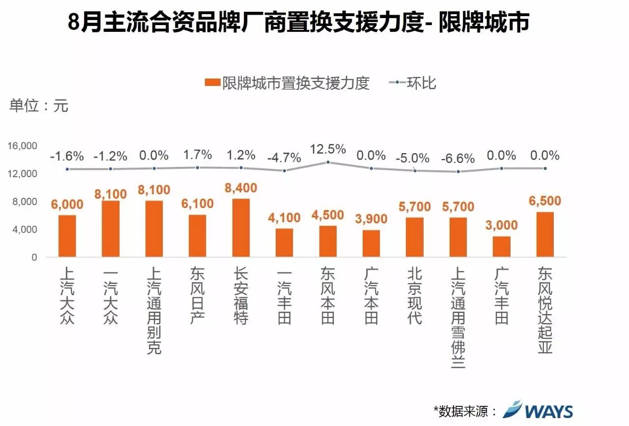 8月主流合资品牌整体厂商置换支援力度基本延续7月;非限牌城市置换支援5,600元,限牌城市置换支援6,400元。
