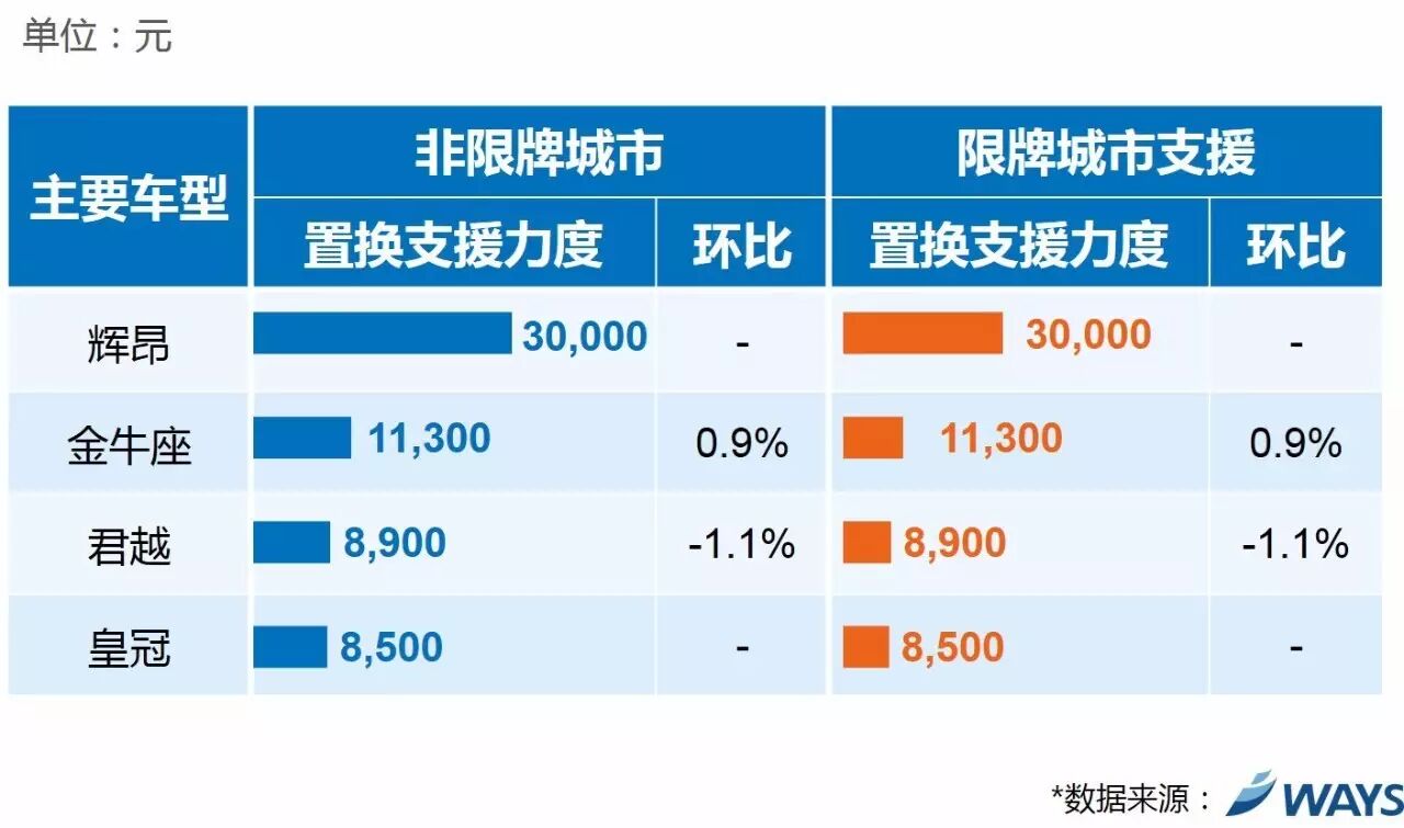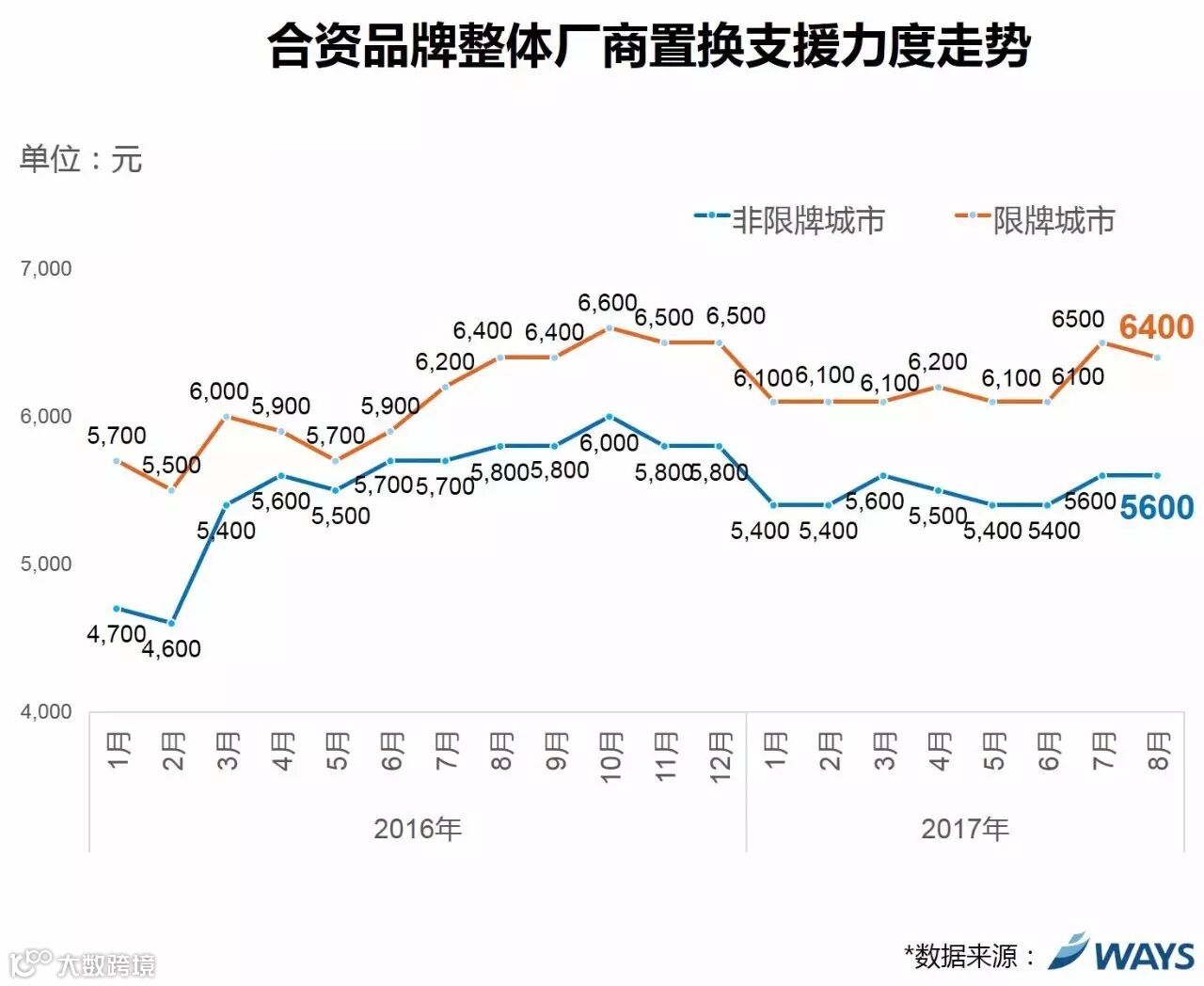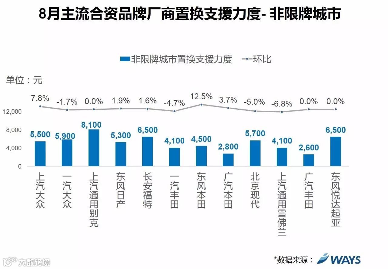 8月主流合资品牌整体厂商置换支援力度基本延续7月;非限牌城市置换支援5,600元,限牌城市置换支援6,400元。