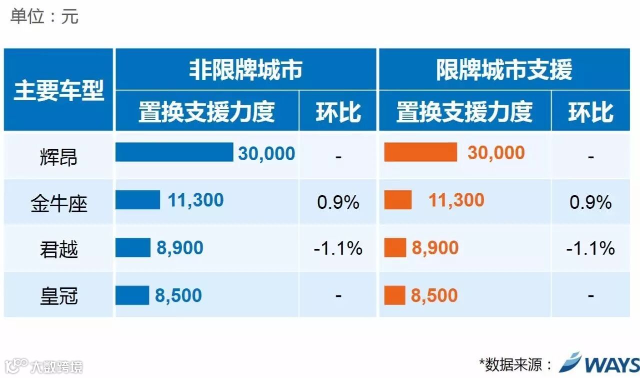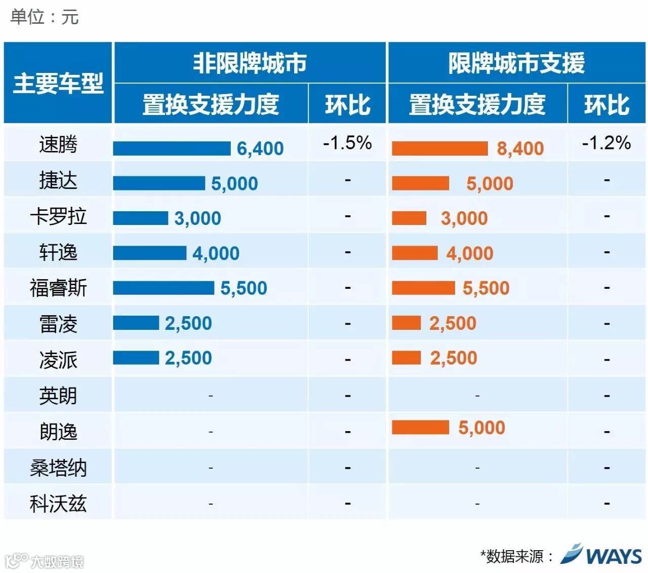 8月A级市场主要车型中,置换支援力度基本延续7月;其中,速腾支援力度依旧最大,且仅该车型在限牌城市的支援力度大于非限牌城市;而朗逸仅在限牌城市提供置换支援;英朗、桑塔纳、科沃兹暂无厂商置换支援。