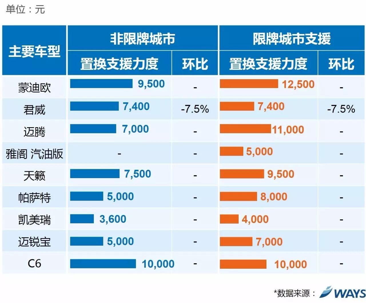 在非限牌城市中, C6的置换支援力度最大,达10,000元;在限牌城市方面则是蒙迪欧,达12,500元;雅阁汽油版仅在限牌城市提供置换支援。