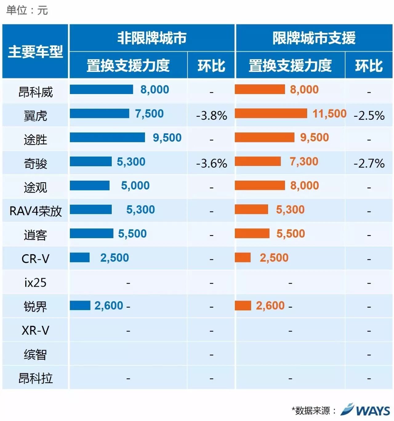 8月SUV市场主要车型的厂商置换支援力度基本延续7月;其中,翼虎、奇骏、途观在限牌城市的支援力度大于非限牌城市。其余车型全国置换支援力度保持一致。