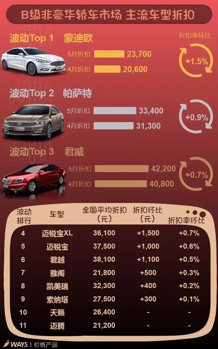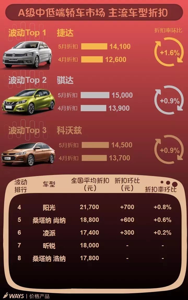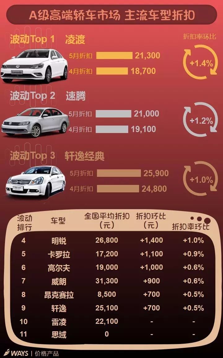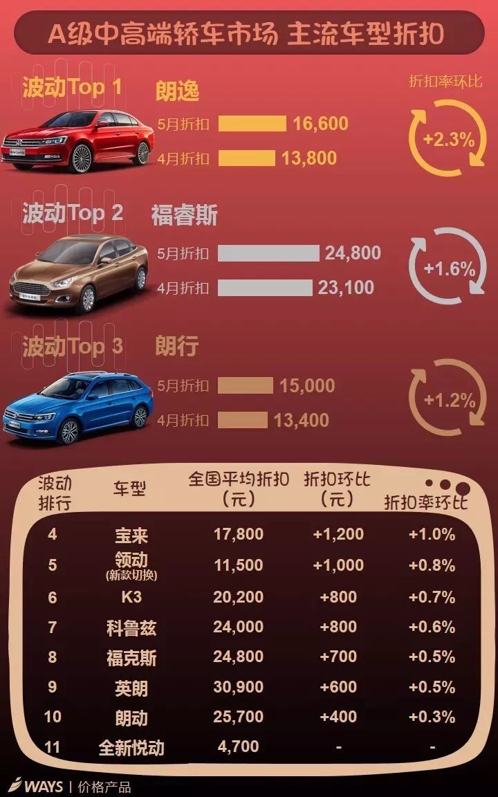 品牌方面,大众和福特主要车型折扣增加明显,朗逸和捷达折扣率分别增加2.3%和1.6%;而福特福睿斯、蒙迪欧以及翼虎折扣率增加1.5%至1.6%。