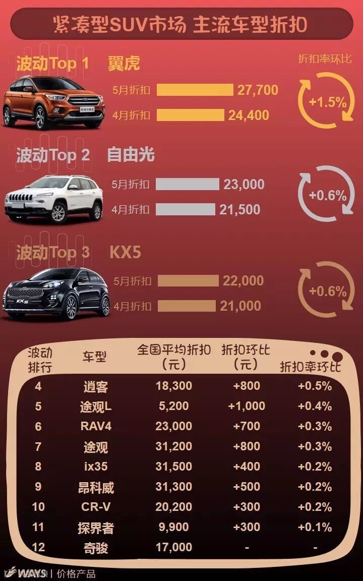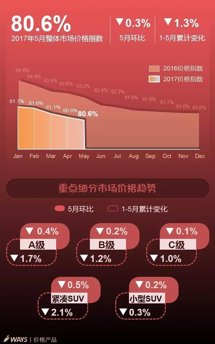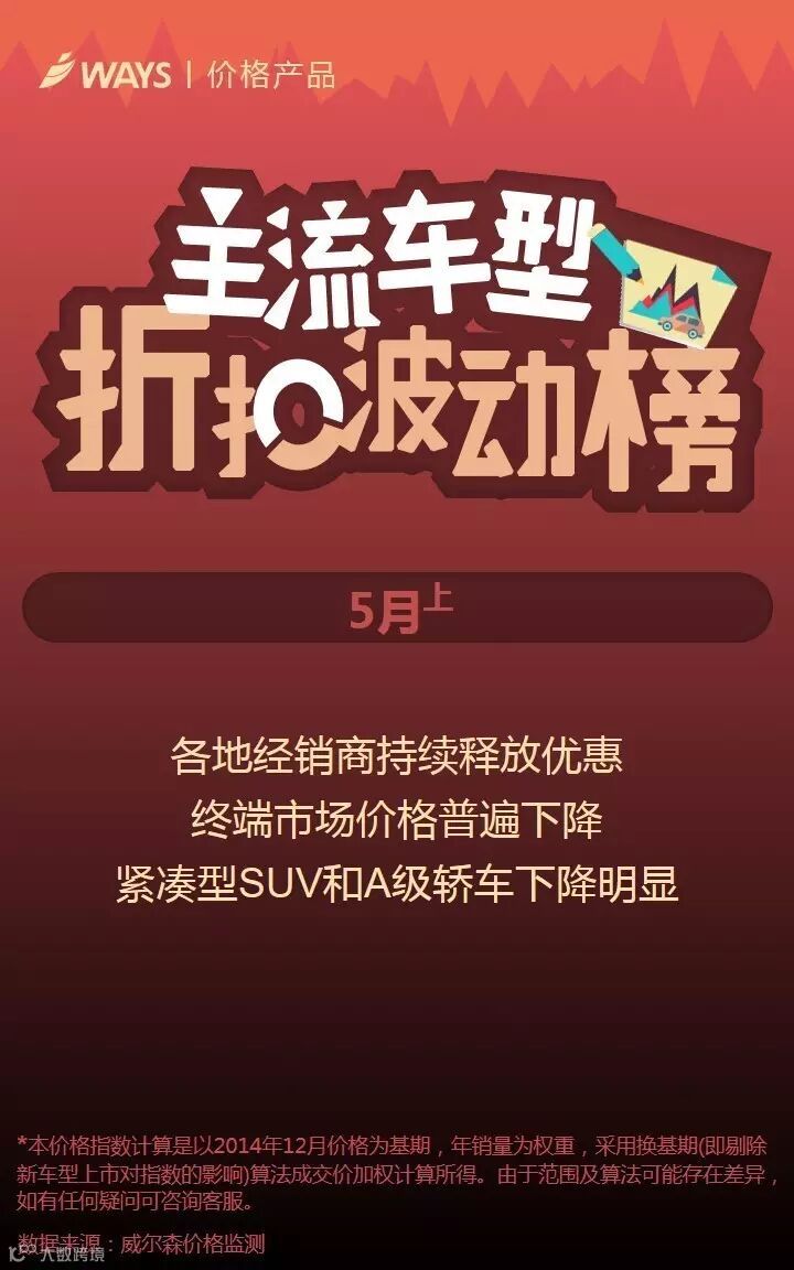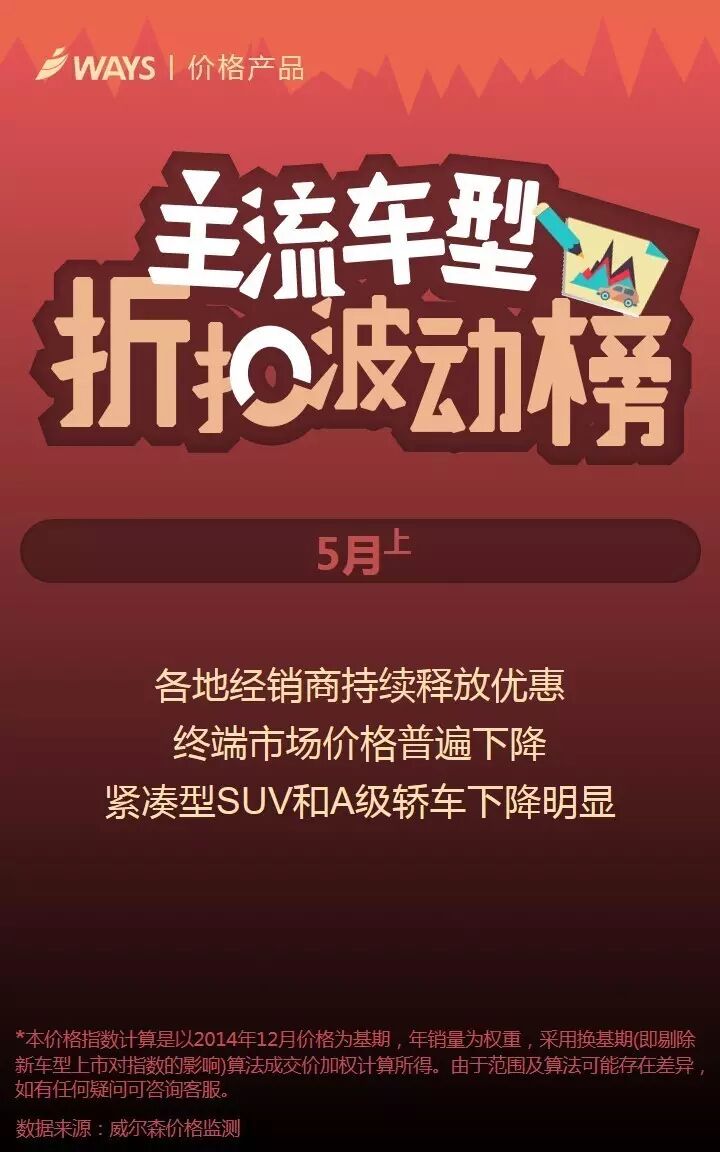 5月上旬,各地经销商借机五一小假期释放优惠来刺激销量,终端市场价格普遍下降,其中,紧凑型SUV和A级轿车下降明显。