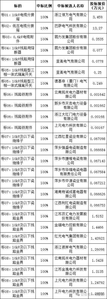 云南电网有限责任公司2024年配网第1批物资框架采购(公开招标),经评标委员会评审,现将中标候选人公示如下: