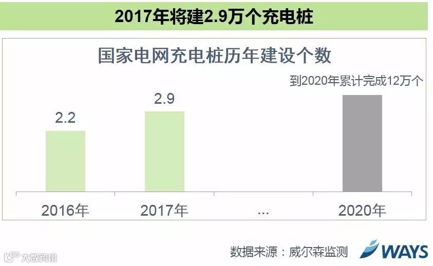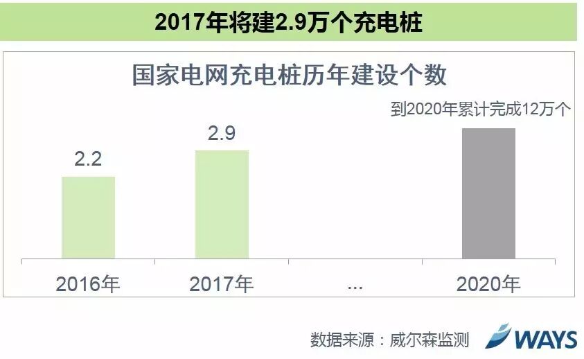 国家电网表示,直至2016年已累计完成4.4万个充电桩建设,2017年将建设2.9万个充电桩,到2020年累计建成12万个充电桩。