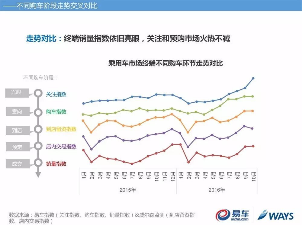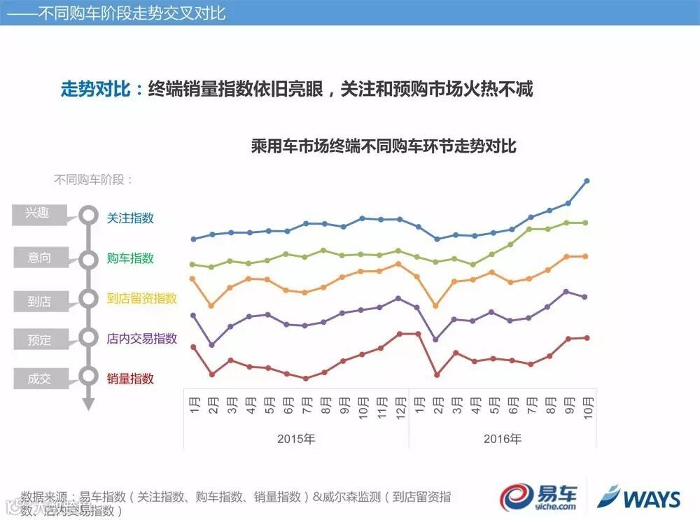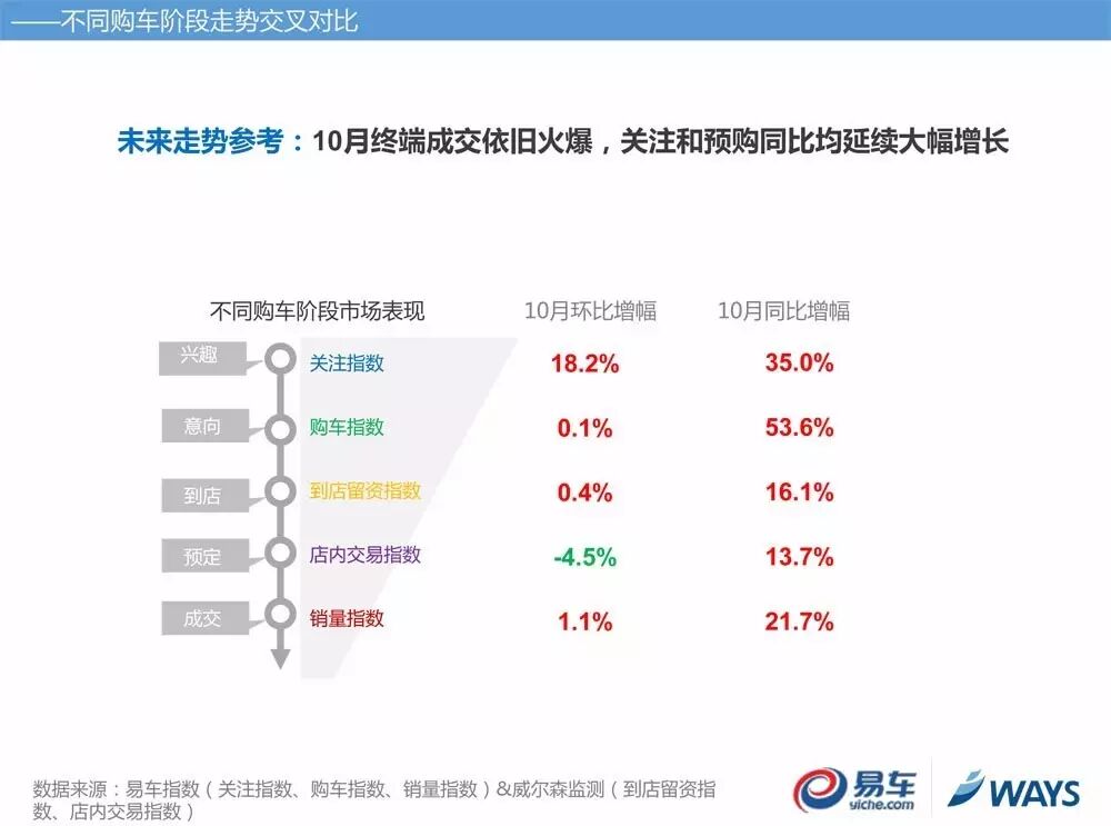 在10月份消费者整个“线上+线下”购车周期中,除店内交易指数出现小幅下滑外,其他四大指数均延续增长。其中关注指数和购车指数同比大幅增长,这也预示着今年最后两个月,仍潜藏有大量购车需求有待释放。