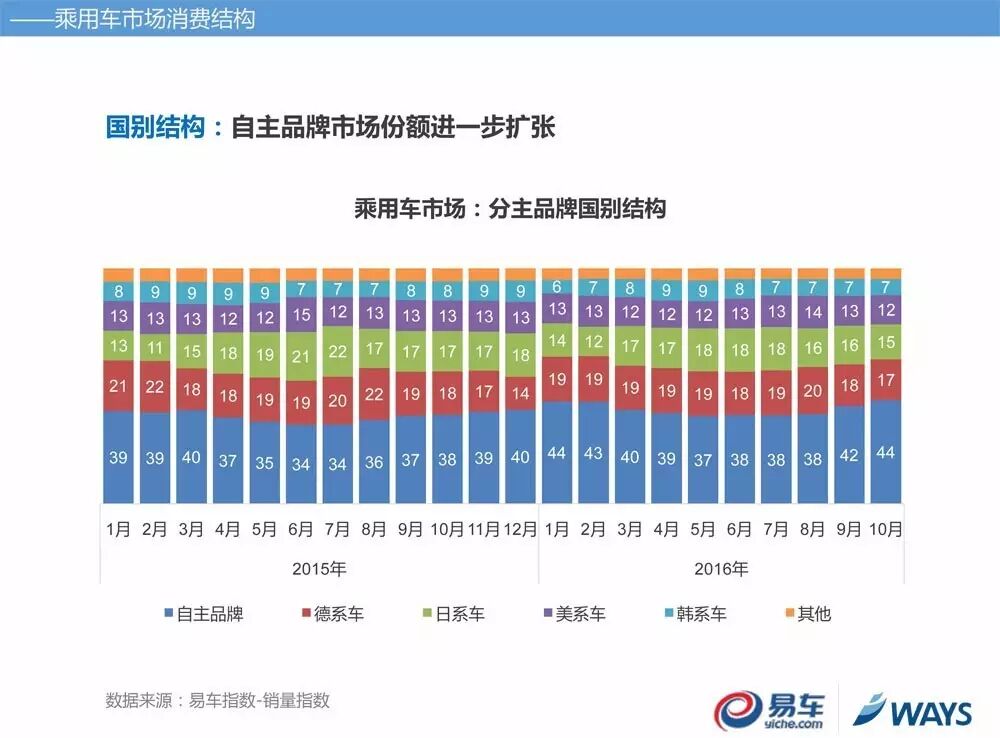 从国别来看,自主品牌凭借SUV以及微小型车销量的增长,本月市场份额环比和同比保持双增长,而德系、美系和日系同比9月均出现1%的下降,11-12月其或有所回升。