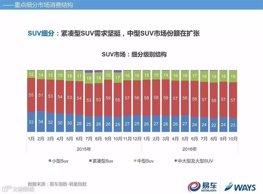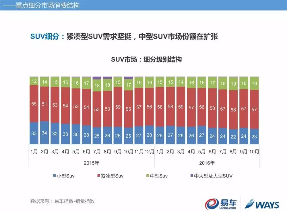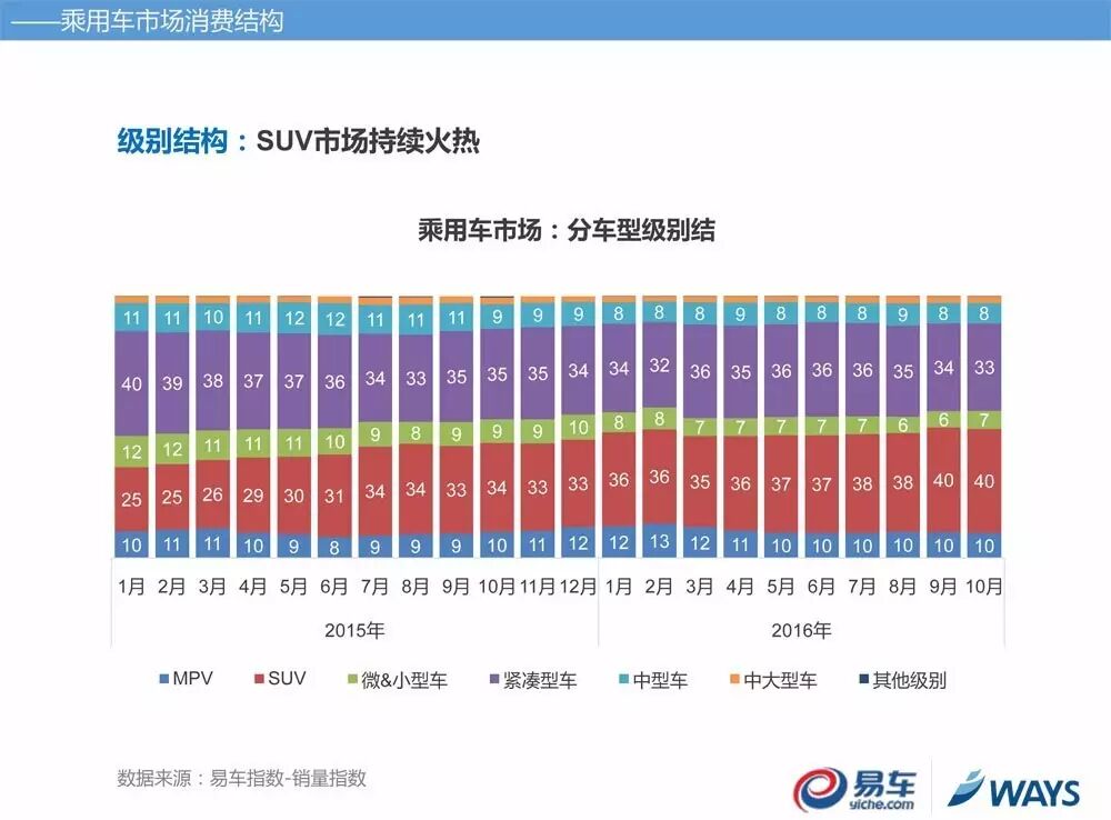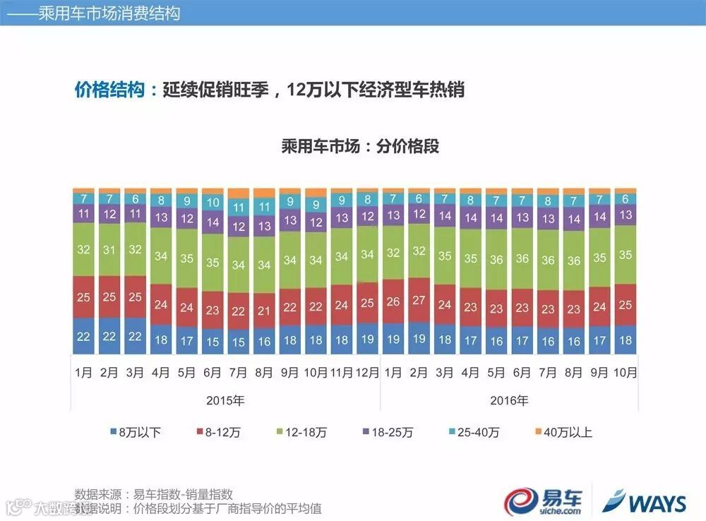 从消费结构来看,消费者对SUV消费热情不减,10月SUV销量占比与9月相同,保持在两年内的最高值40%。鉴于汽车销售传统旺季的结束,SUV销量占比或将在2017年再创新高。