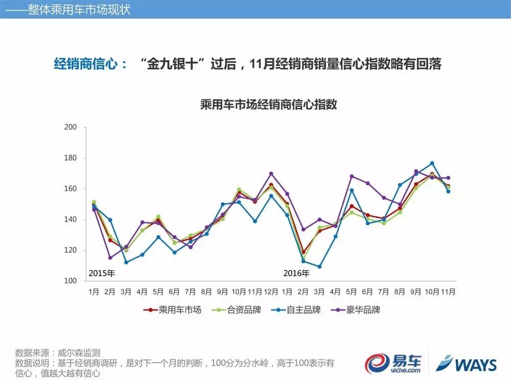 不过在“金九银十过后”,各类品牌经销商对11月的销量信心指数均呈现下降,其中下降最多的是自主品牌,合资品牌和豪华品牌下降甚少甚至与10月持平,一线经销商更明白,年底消费者尚未释放的购买需求,最终也许更倾向合资和豪华品牌。