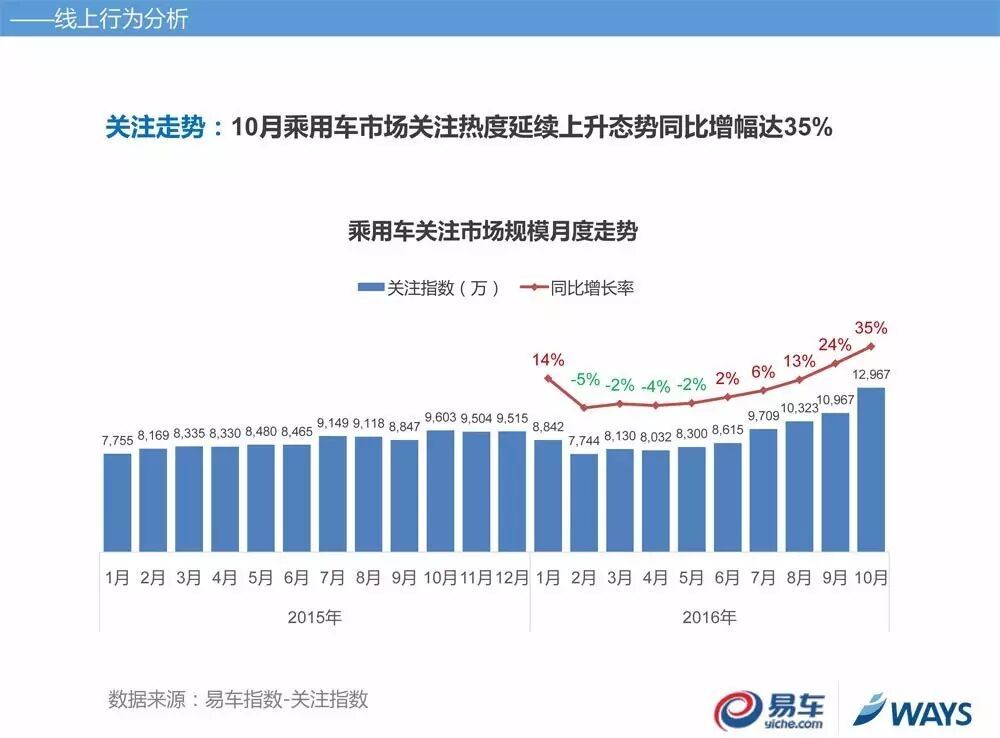 10月整体汽车市场的关注热度依然持续上升,消费者对乘用车的整体关注指数同比增长高达35%。另一个重要因素是11月的广州车展,各个品牌新车发布的预热传播,会进一步提升消费者对汽车市场的关注,加强11月汽车销售能量的积蓄。