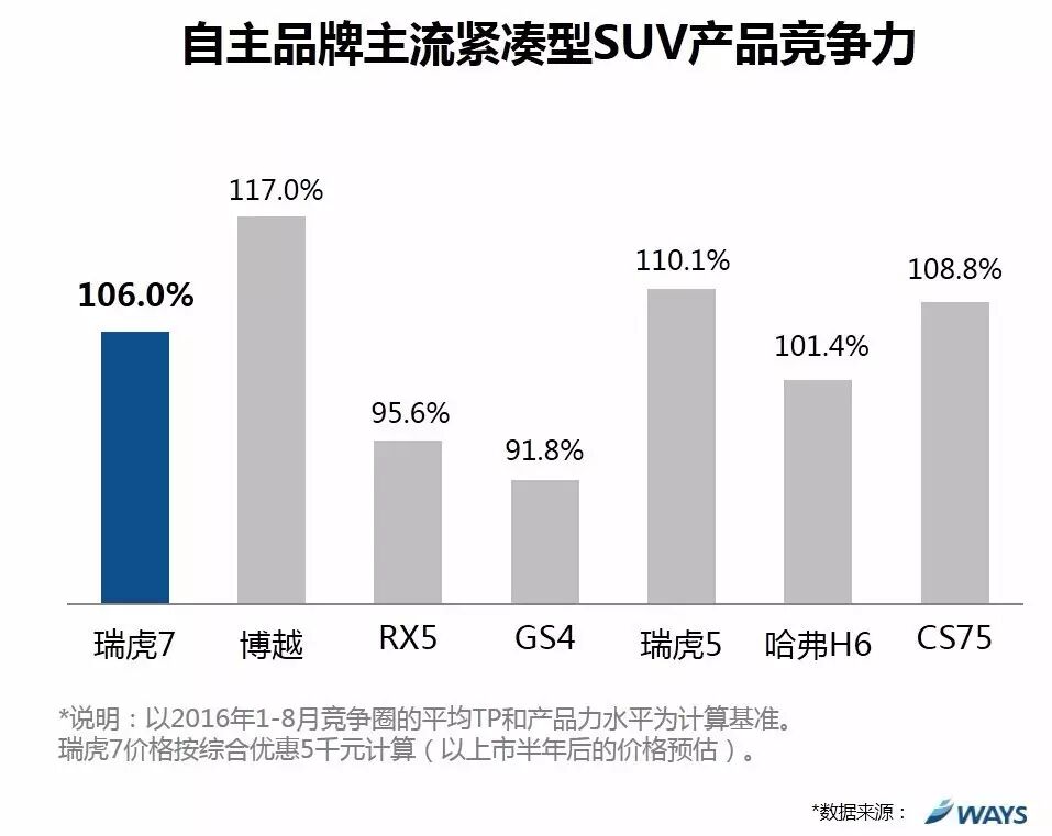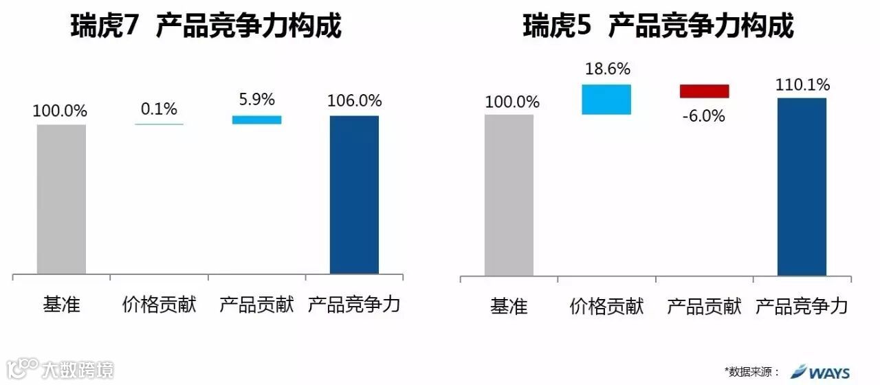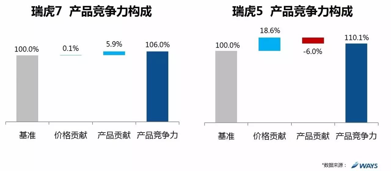 同品牌来看,虽然瑞虎7的产品竞争力(106.0%)稍低于瑞虎5(110.1%),但通过具体分析可知,瑞虎5主要靠价格贡献大幅拉动竞争力,而瑞虎7产品贡献明显占优。这也说明基于全新平台打造的瑞虎7在产品性能上有了质的提升。考虑到两个车型各自的主销价格段差异,瑞虎7的市场表现将不弱于瑞虎5。姜不一定是“老”的辣哦~