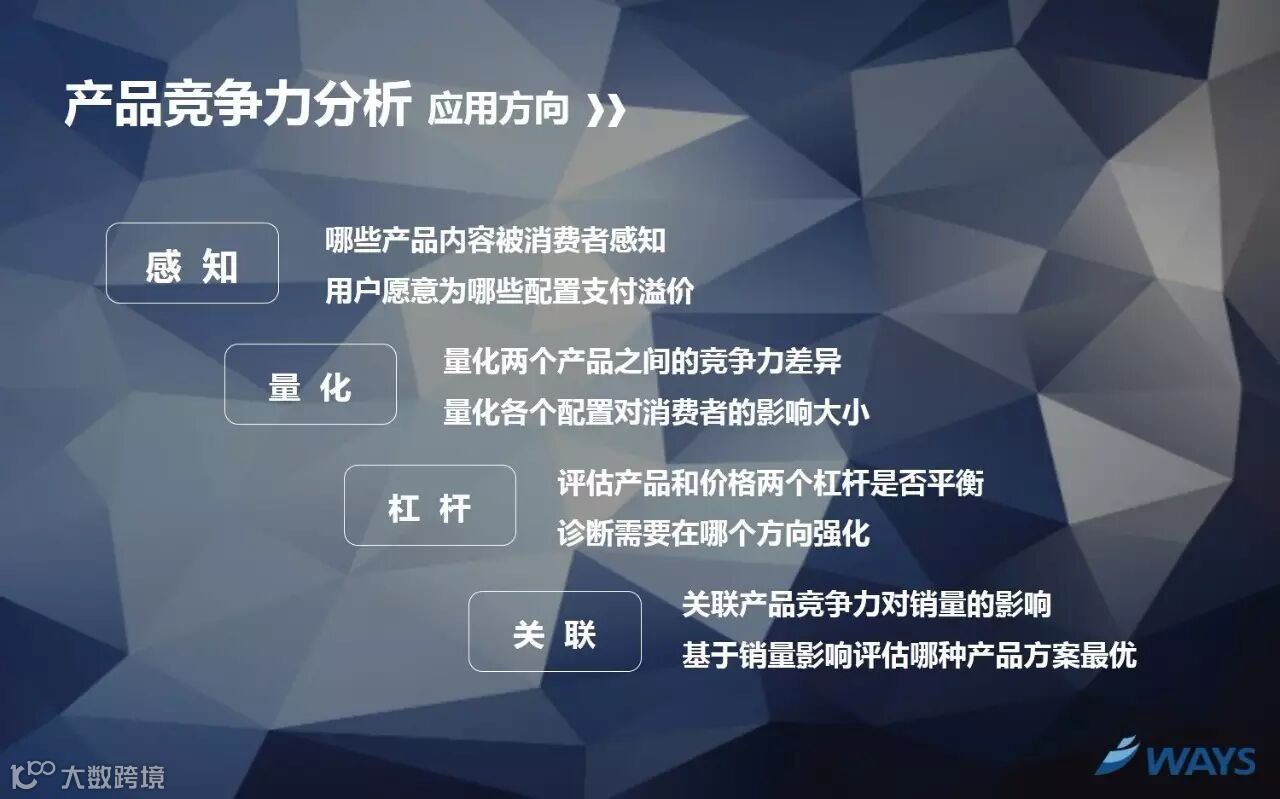 WAYS产品竞争力分析是反映用户心目中的产品性价比的综合指数。在新车上市阶段,可划定竞争圈、量化产品竞争力强弱,并给出市场销量的预估结果,是企业进行产品诊断及配置优化的有力工具。