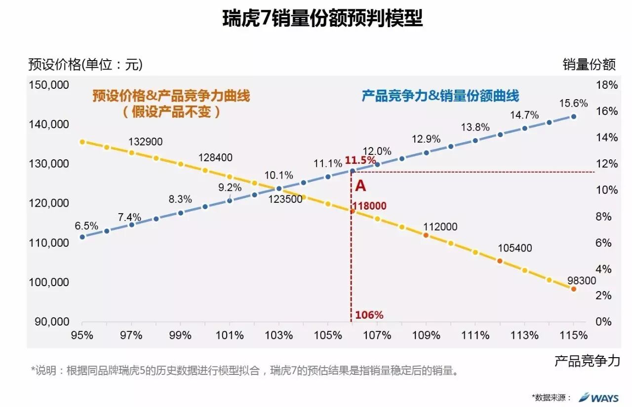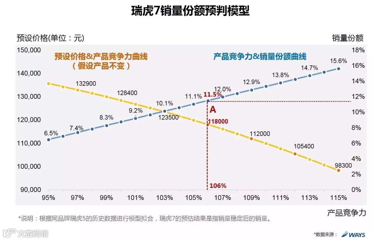 参照瑞虎5的历史表现可建立拟合模型,并以此来预估全新车型瑞虎7的表现。如下图所示,若瑞虎7的TP为11.8万元,则其产品竞争力为106%,对应的市场份额为11.5%(参照16年8月竞争圈销量,约1.38万台/月)。根据图表,还可得到瑞虎7取不同价格水平时所对应的产品竞争力及份额。