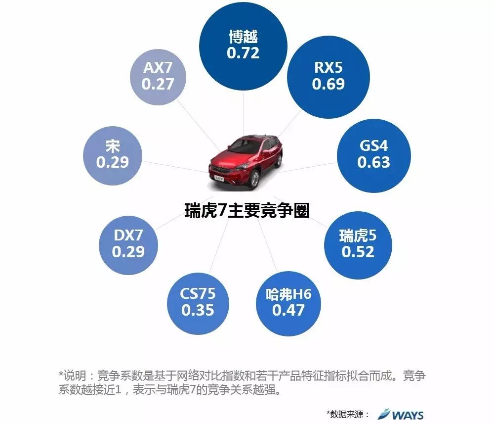 从量化分析结果来看,市场上瑞虎7显然与吉利博越、荣威RX5和传祺GS4对阵。此外,由于品牌背景一致、价格定位接近,瑞虎7或与瑞虎5也存在一定的竞争关系。总而言之,瑞虎7的目标竞品集中在自主品牌的几款主流SUV车型,当前自主品牌尚未具备足够的溢价能力与同级合资车型直接竞争。