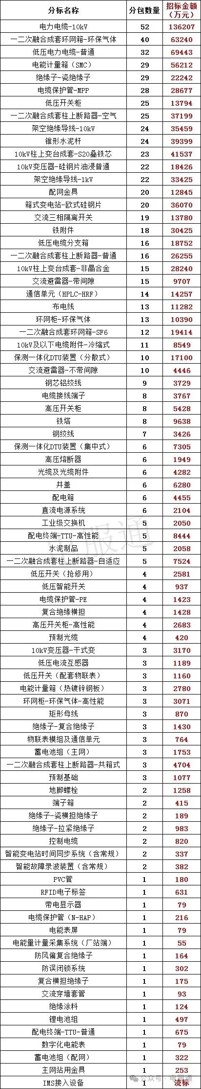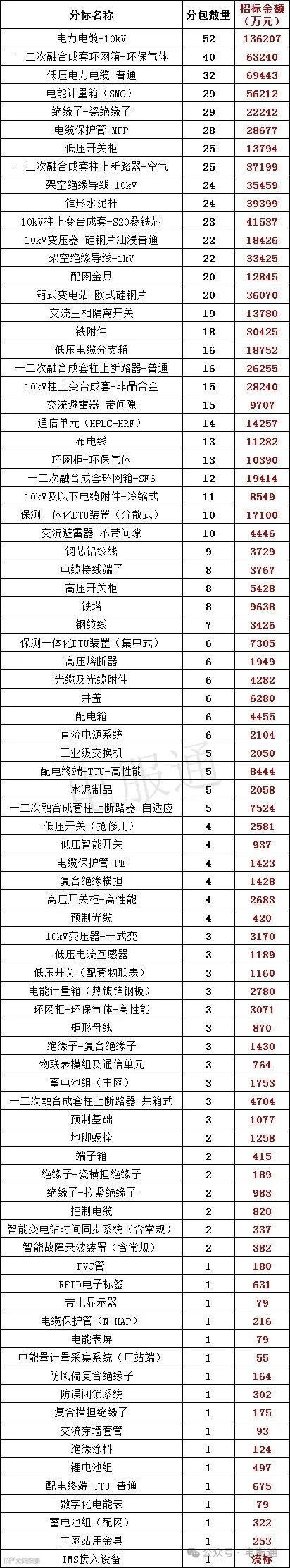 招标金额最多的无疑是电缆,紧随其后的是:一二次融合成套环网箱-环保气体:63240万元,电能计量箱(SMC):56211万元,10kV柱上变台成套-S20叠铁芯:43516万元;